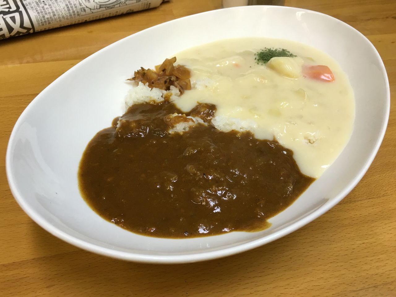合がけ(カレー&ホワイトシチュー)ご飯半分。