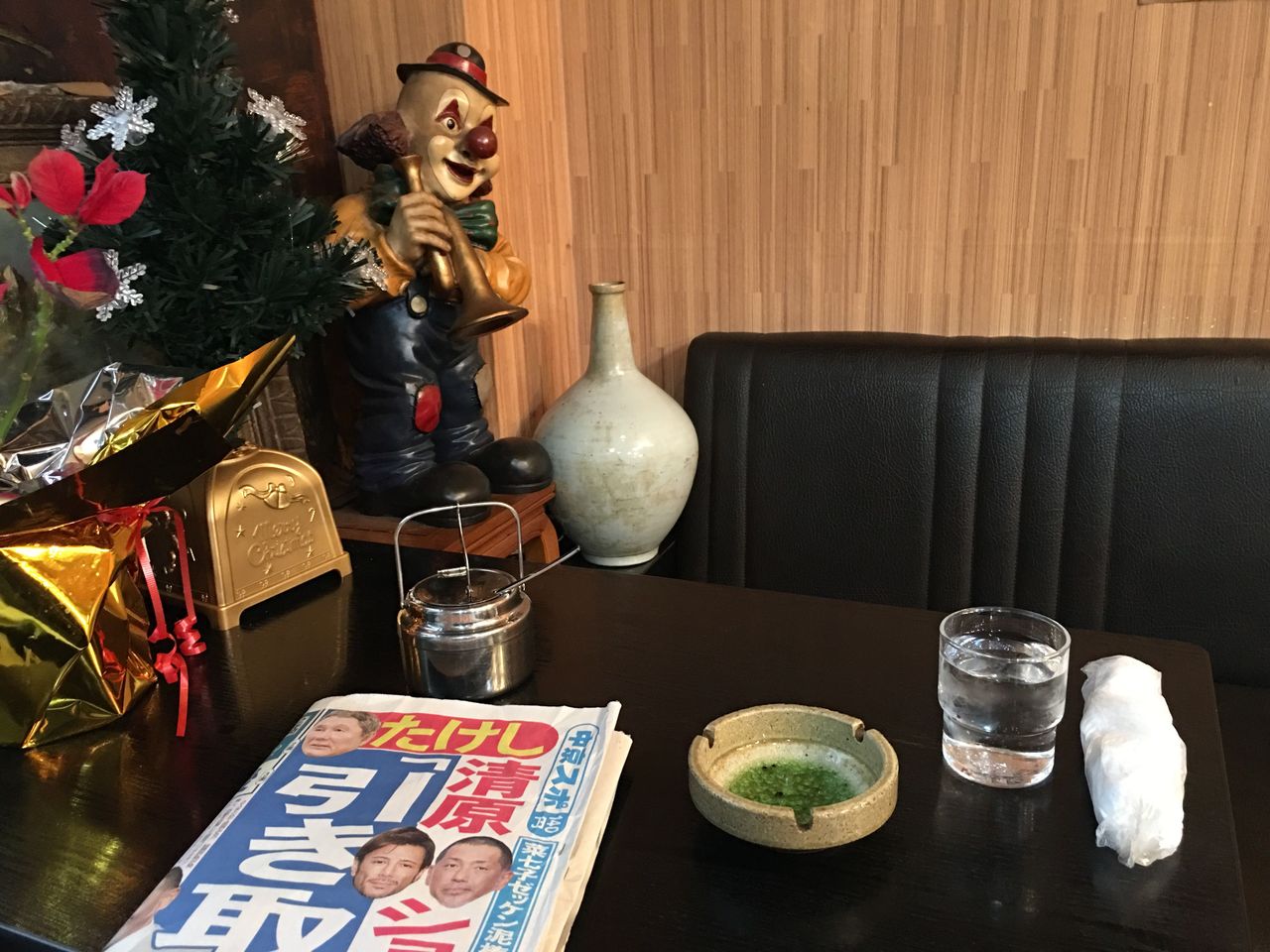 テーブルには灰皿にスポーツ新聞。