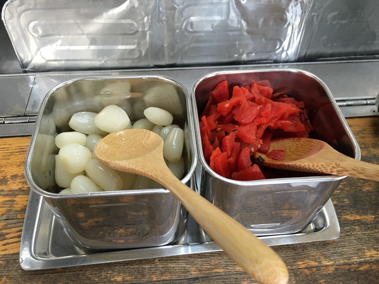 カウンターに常備している漬け物入れは福神漬けにらっきょう。