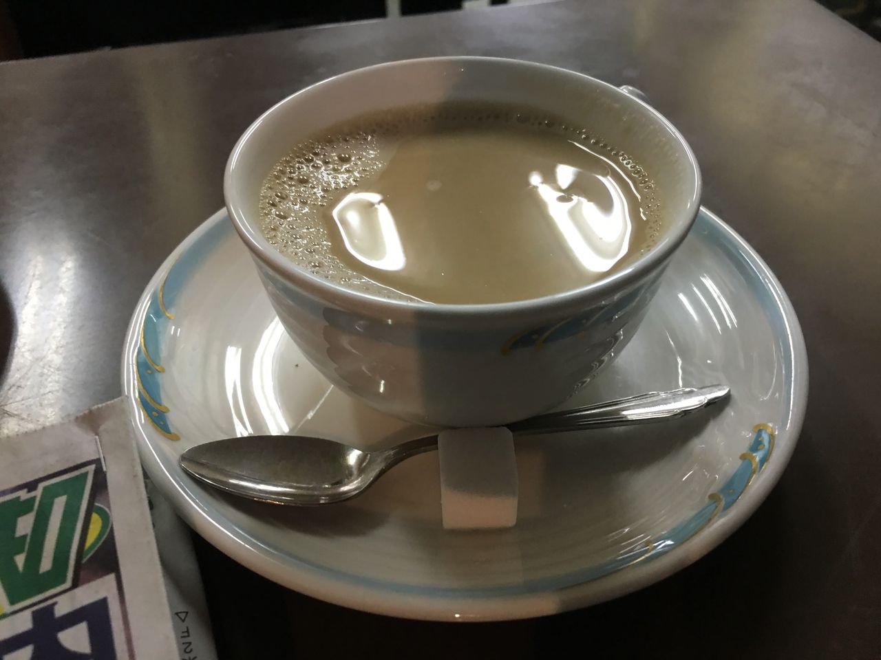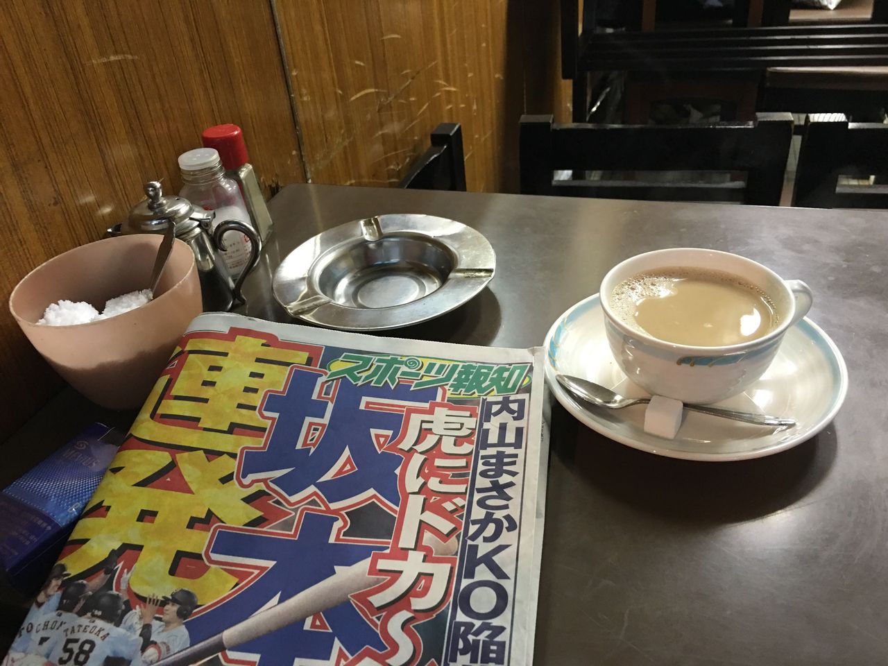 灰皿にスポーツ新聞、そしてミルクコーヒー。
