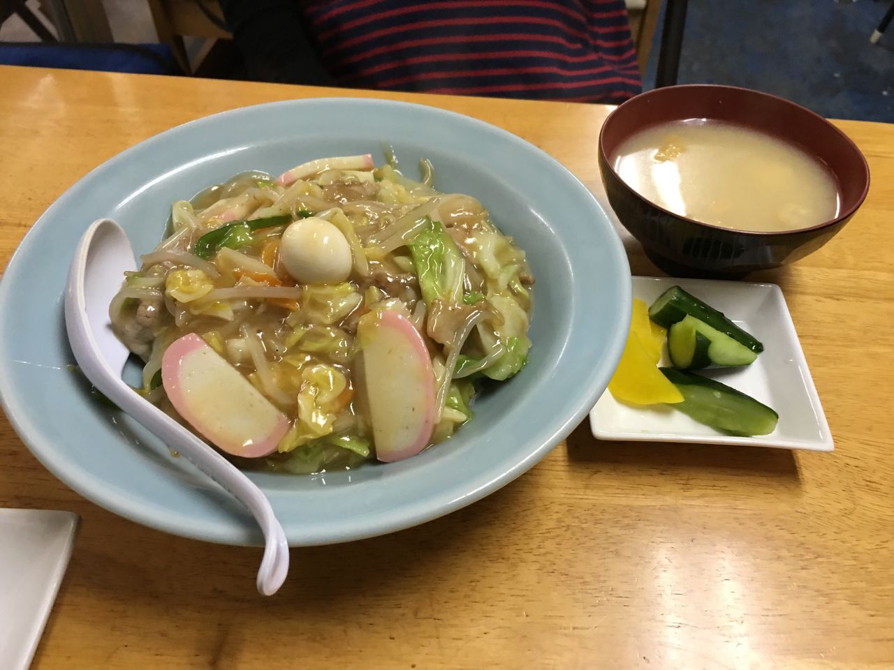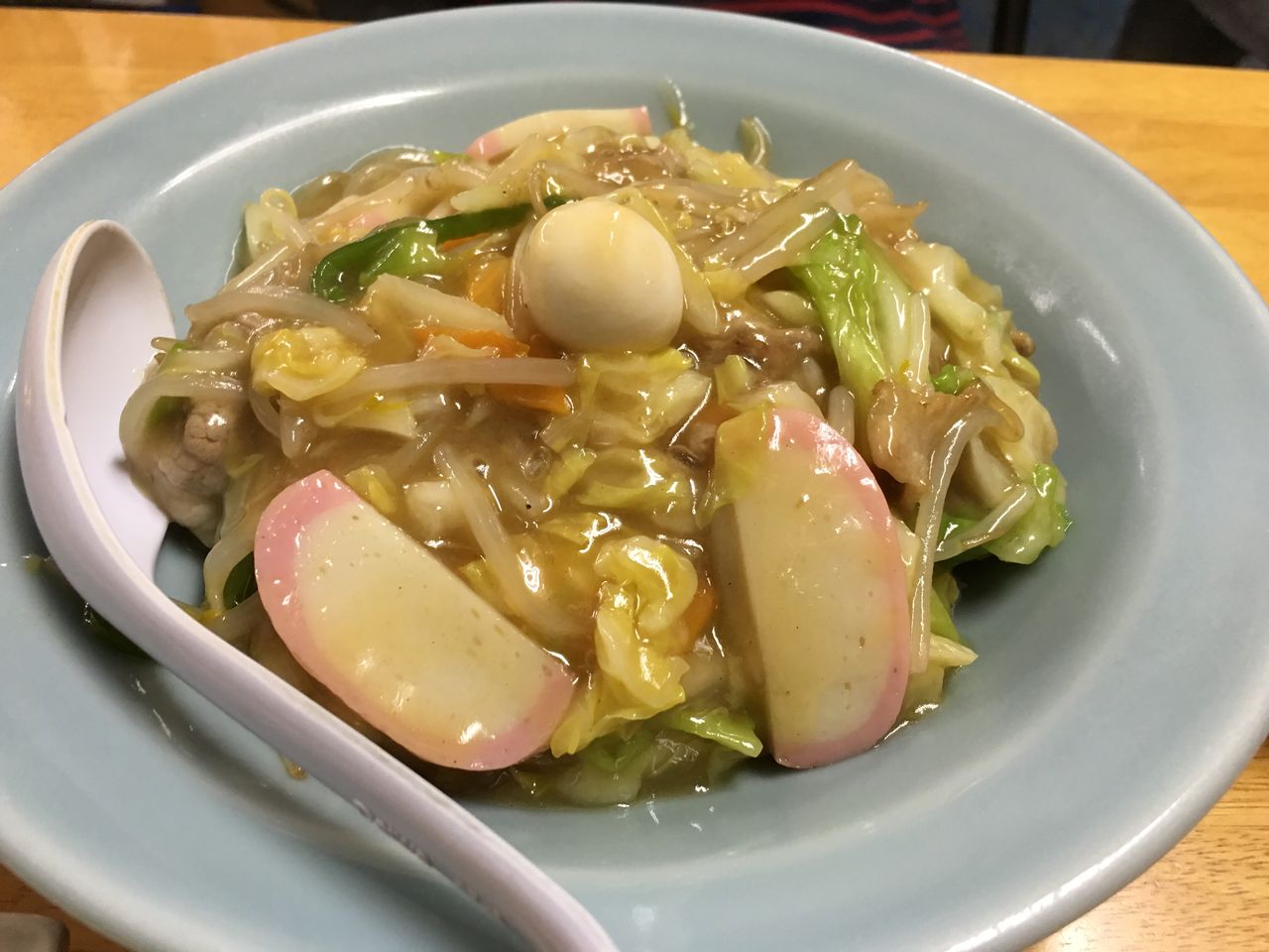 野菜炒めが餡をまとっているだけじゃなくてかまぼこにうずらの卵まで乗っております。