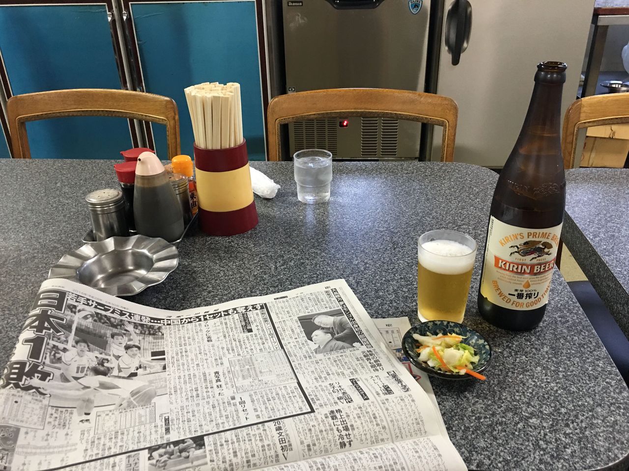 とりあえずビールとスポーツ新聞で平日の朝酒を満喫します。