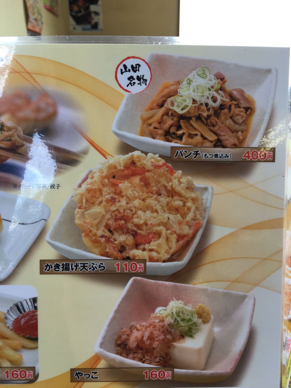 山田うどんのもつ煮はシナチクが入っているので、相当いいつまみです。