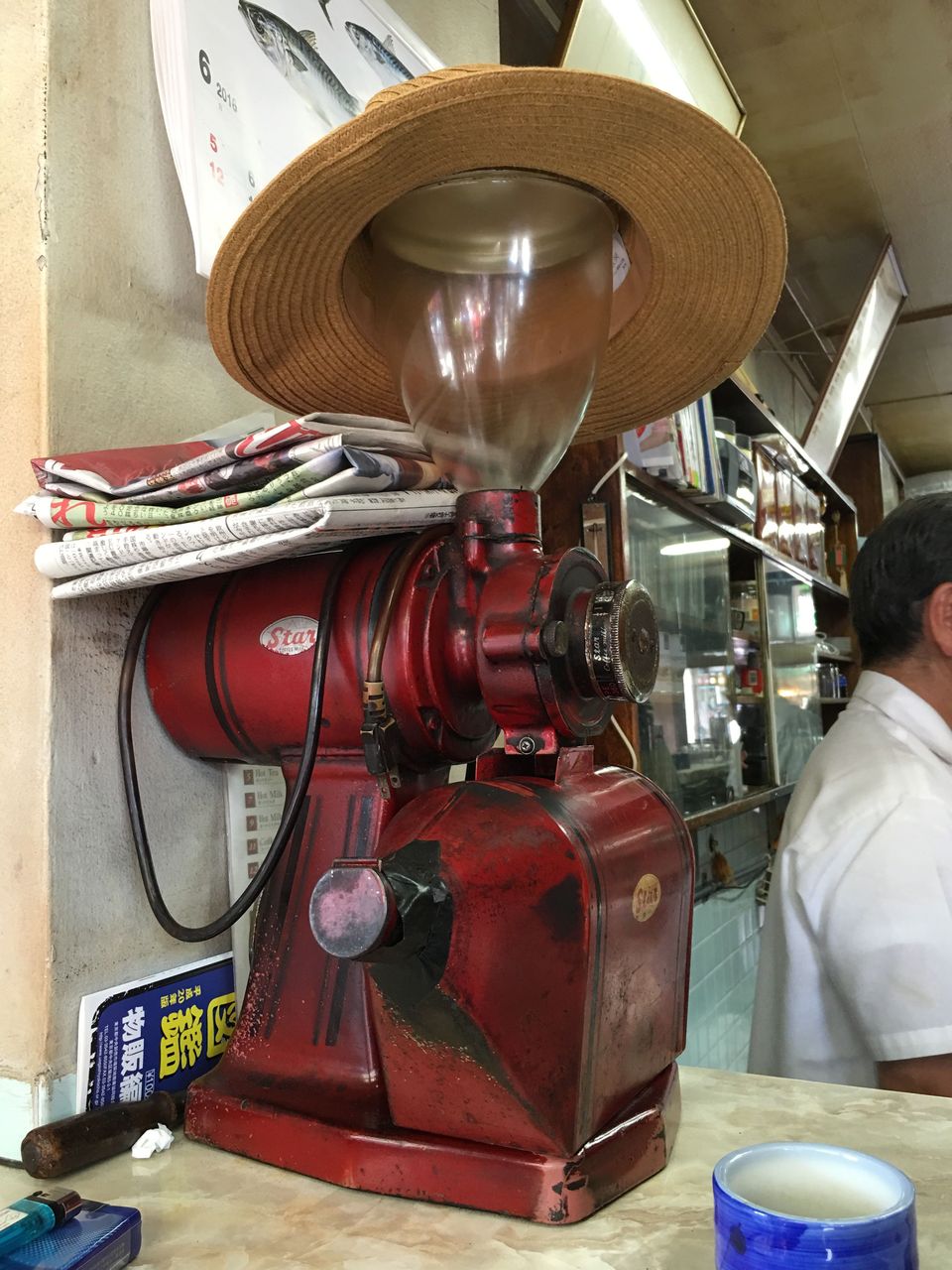 暑くなった日だったのでコーヒーミルも麦わら帽子をかぶっておりました。