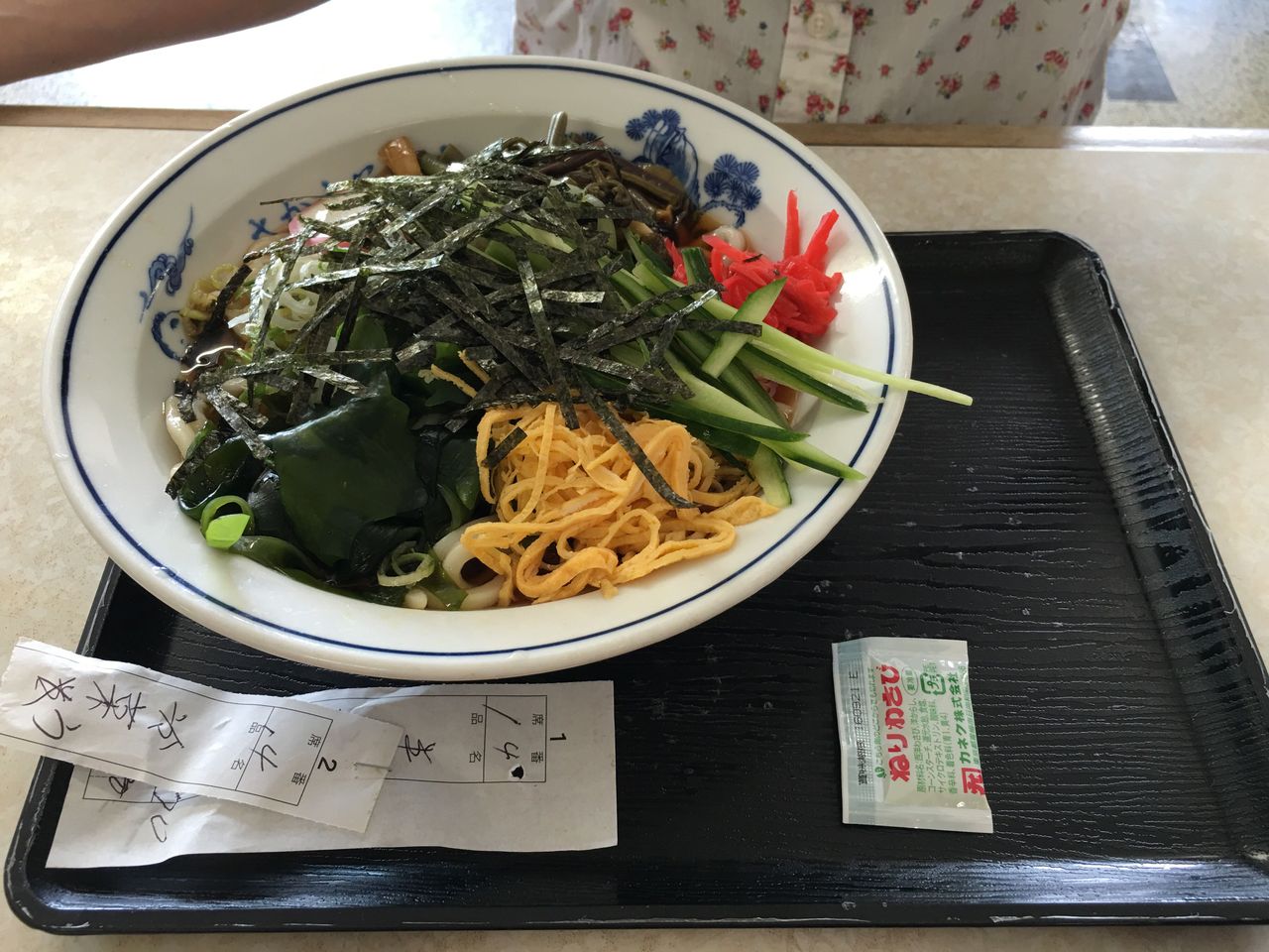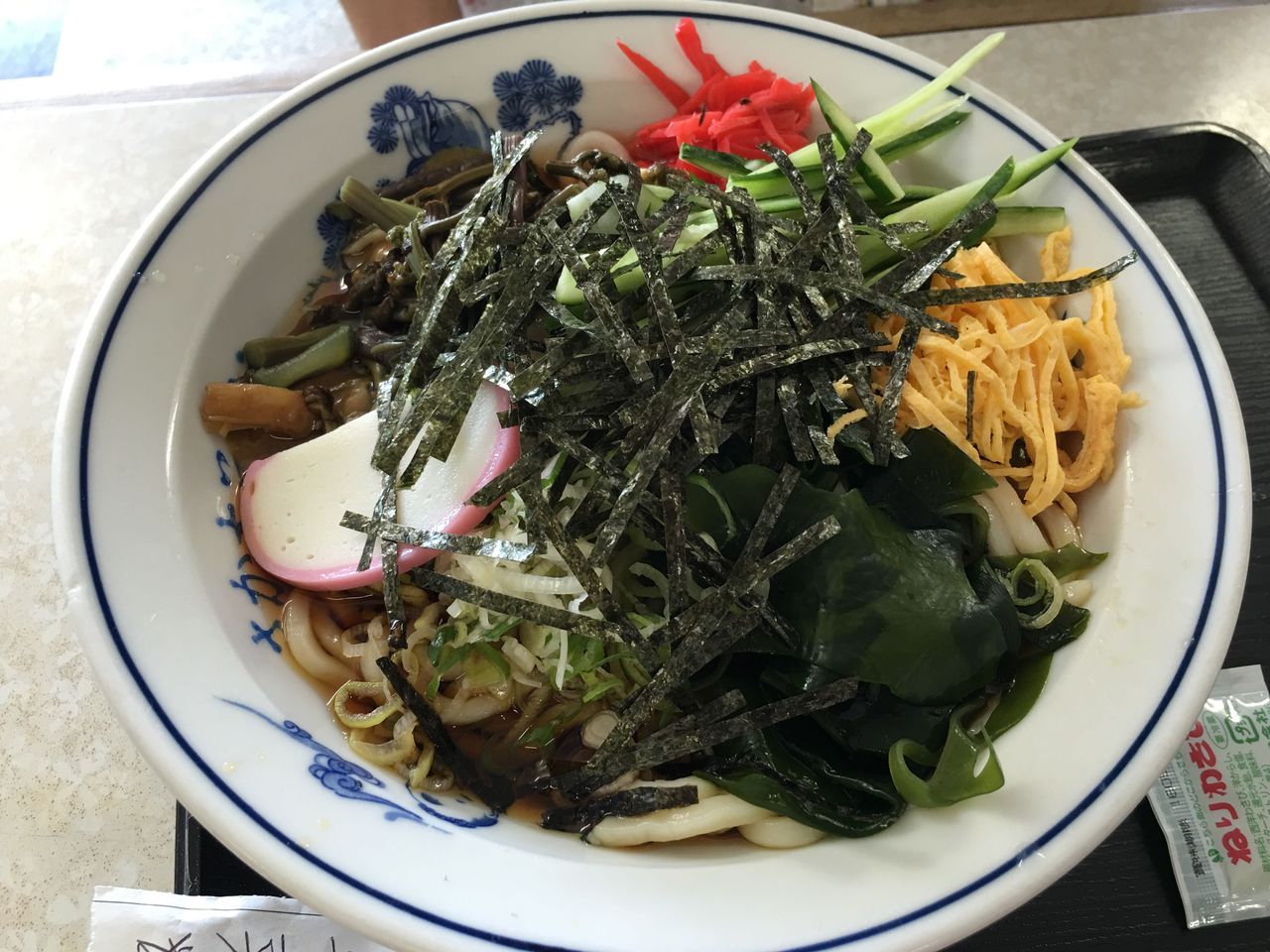 山菜にかまぼこ、海草、錦糸卵、きゅうりに刻みネギ。