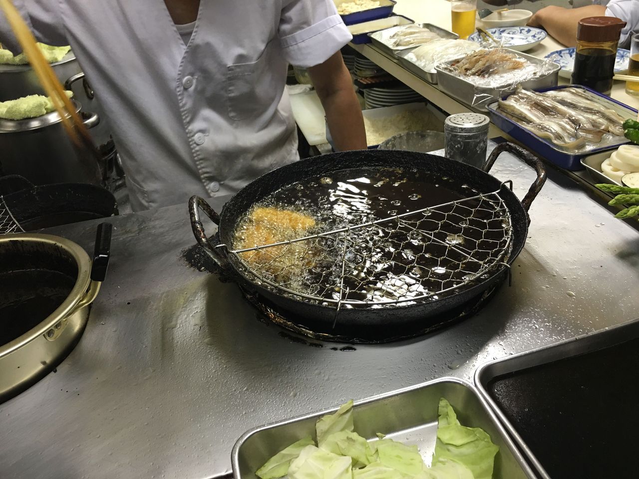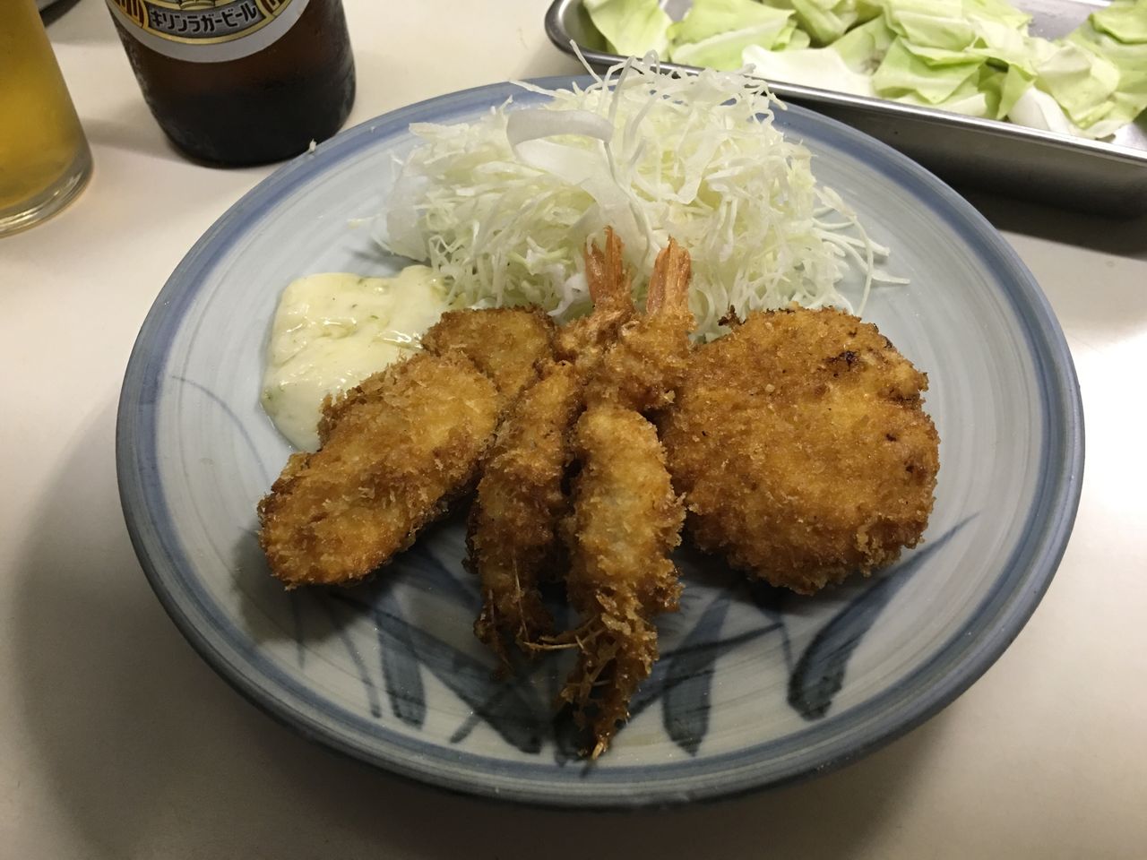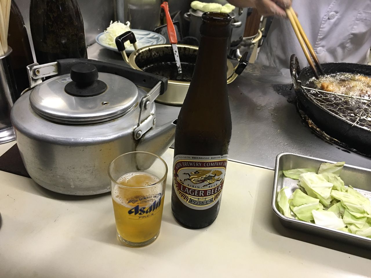 自分のフライが揚がっている姿を見ながら一杯いただきます。