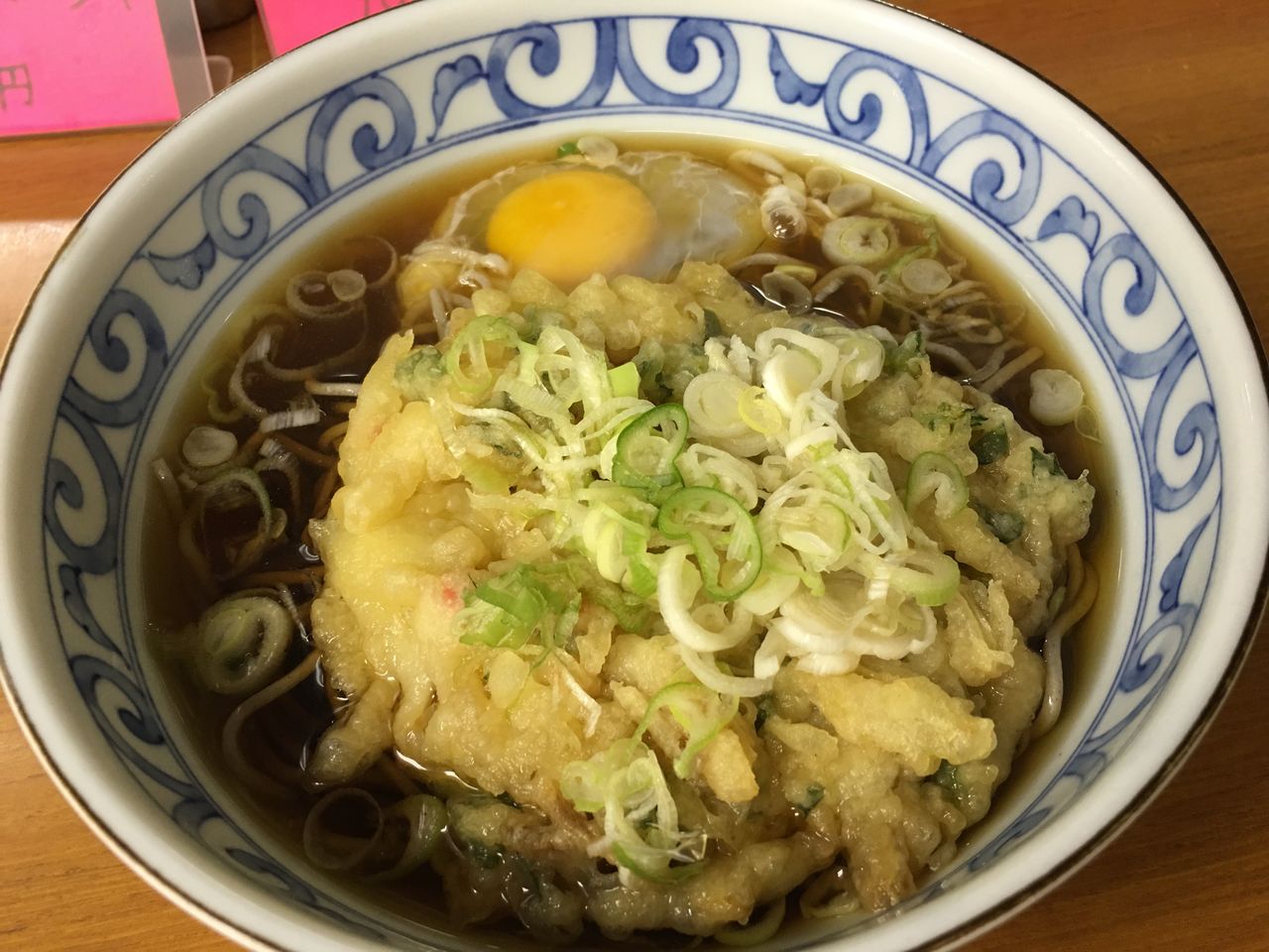 揚げてからしばらくたっただろうかき揚げを乗せ、濃い目のつゆをぶっかける。