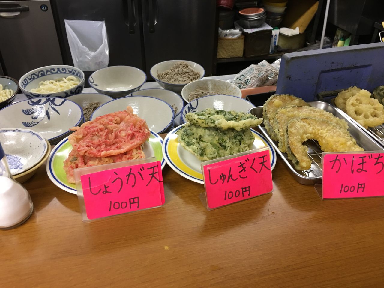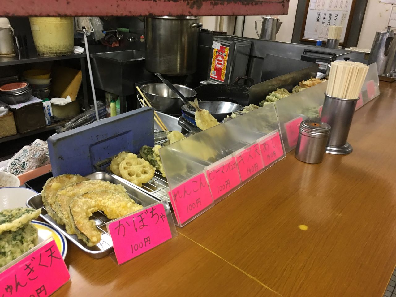 こちらの流儀は入店したら、蕎麦かうどんを選んで、カウンターに並べられた天ぷらを選び注文といった昔ながらの立ち食いソバ。