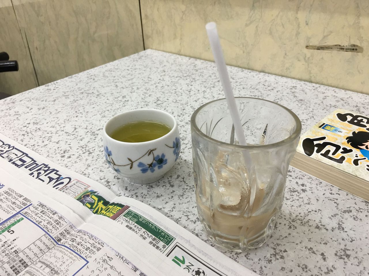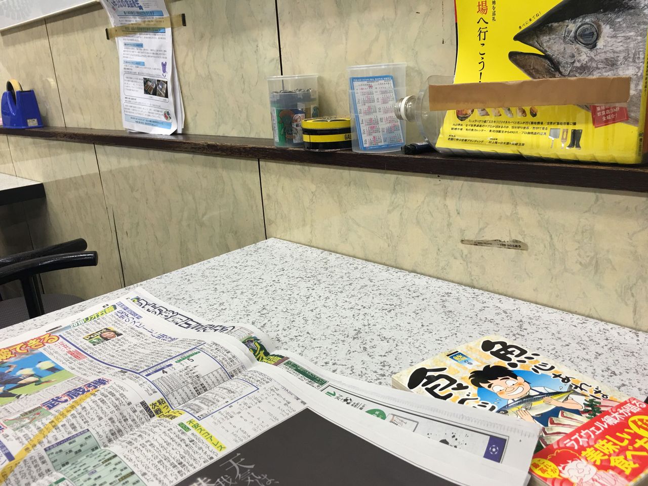 テーブルの上にはスポーツ新聞に…、テーブルの横には老眼鏡。