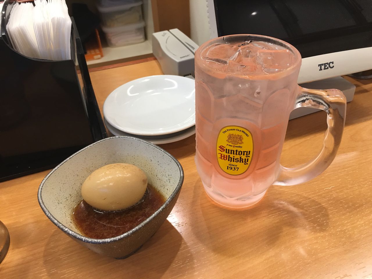 とりあえずここでしか飲めない”ベニショー割り”に”限定煮卵”。