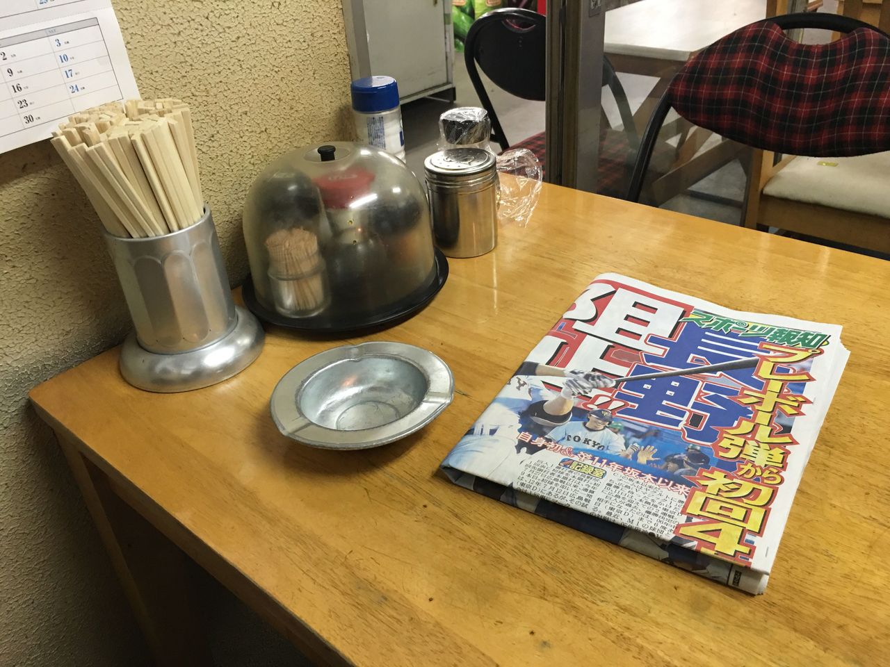 安定のスポーツ新聞に灰皿。