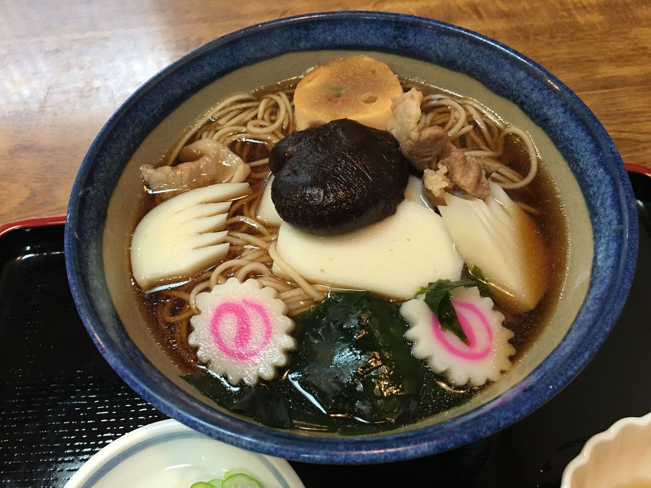 分厚いかまぼこに飾り包丁。干しシイタケ、麩、ナルト、鶏肉にわかめがはいった豪華版。
