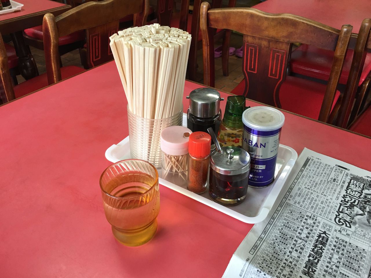 灰皿はありませんが、基本調味料にスポーツ新聞、あっつい時期だったのでお冷が提供されます。