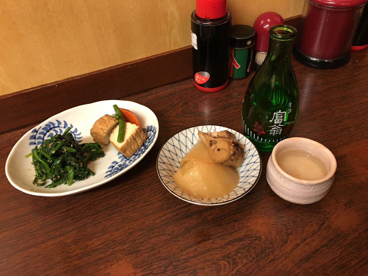 本日はほうれん草の胡麻和えに厚揚げの煮物。付け出しはホカホカのブリ大根。
