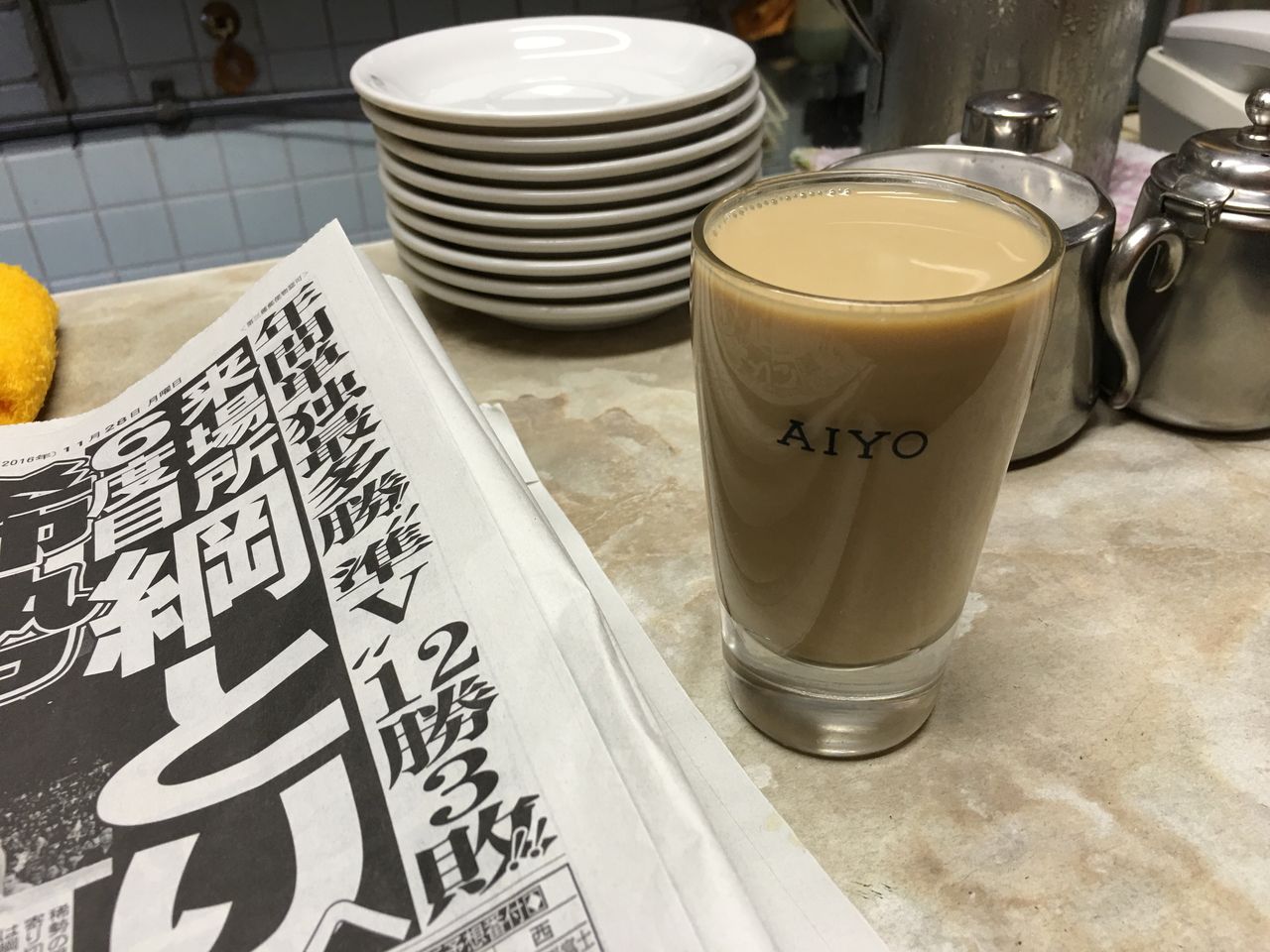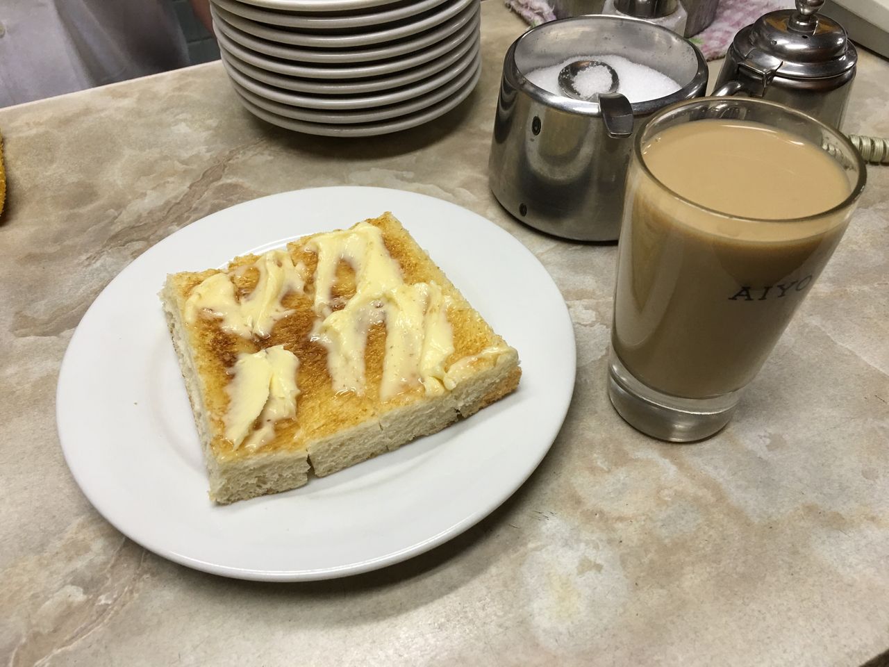 市場でトースト (耳なしダブルバター)、ミルクコーヒー@愛養(築地場内市場)