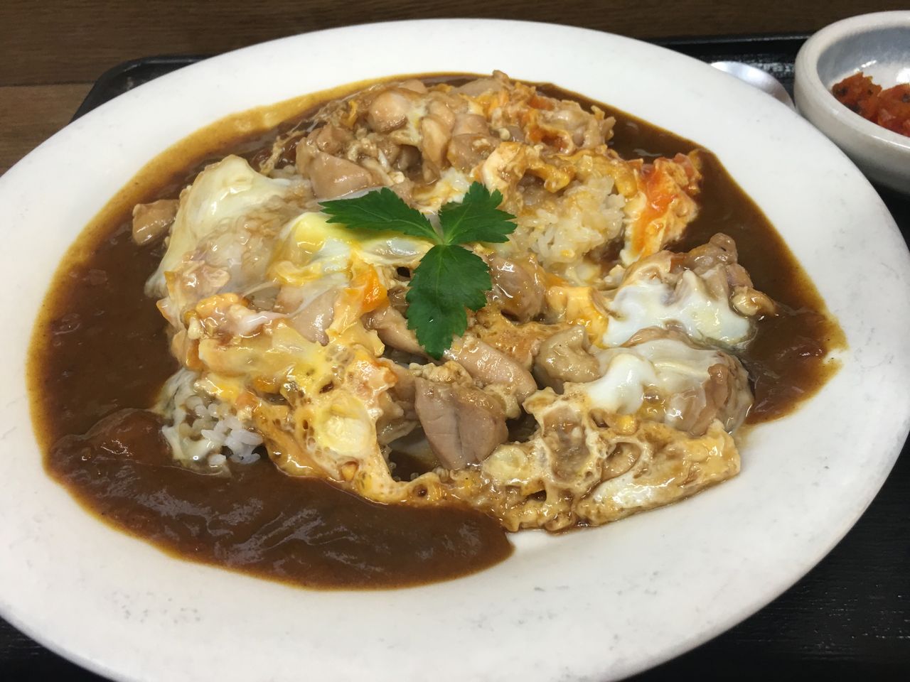 親子丼だけでも美味しいんですが、カレーをかけるって遊び心が楽しいですね。