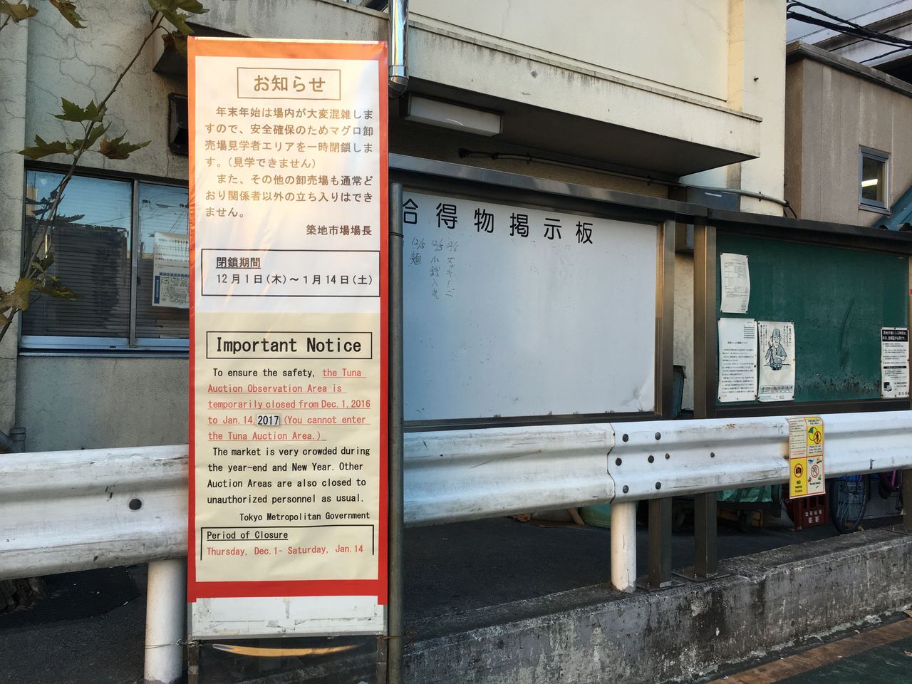 年末年始はマグロ卸売場見学者エリア閉鎖の看板。