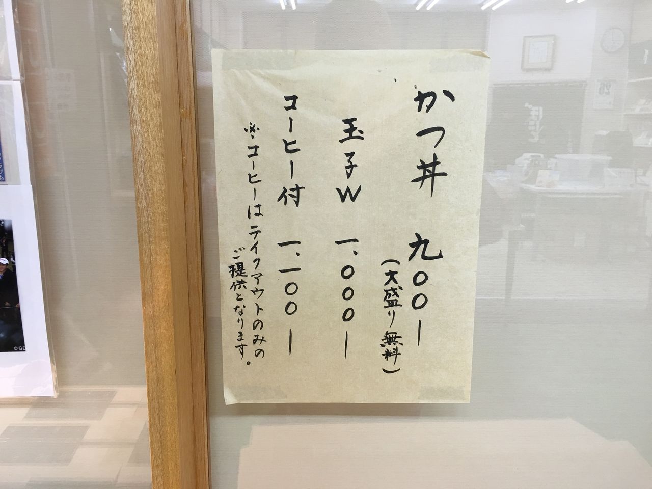 確か奥さんが元キャディーで、かつ丼作るのが上手で、なんて話を聞いたような…。メニューはかつ丼とかつ丼の玉子Wと珈琲の硬派な感じと思いきや。