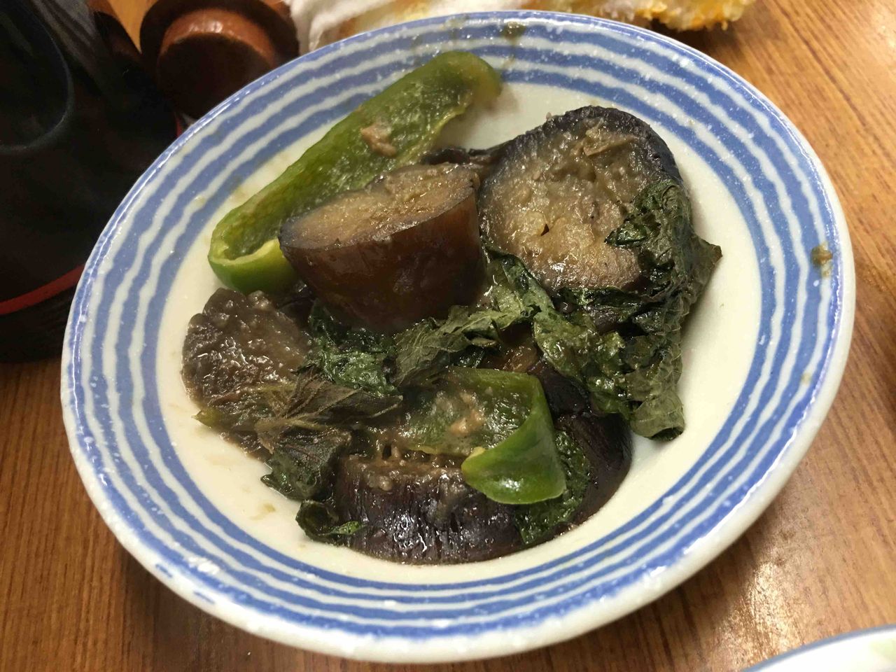 ナスにピーマンにシソが甘い味噌で和えられています。