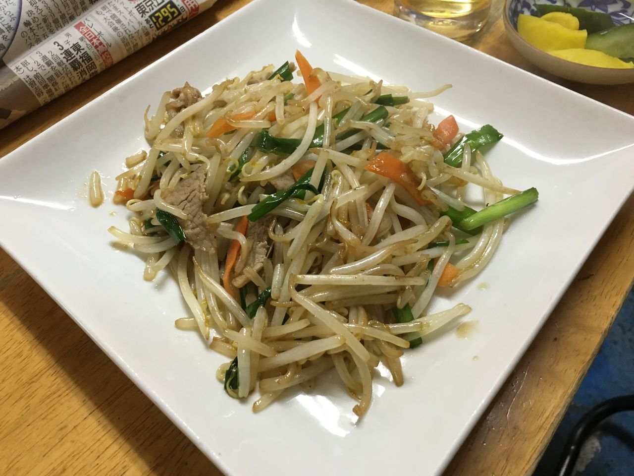 もやし炒めと言いながら、ニラも人参も、豚肉まで入った豪勢なもの。
