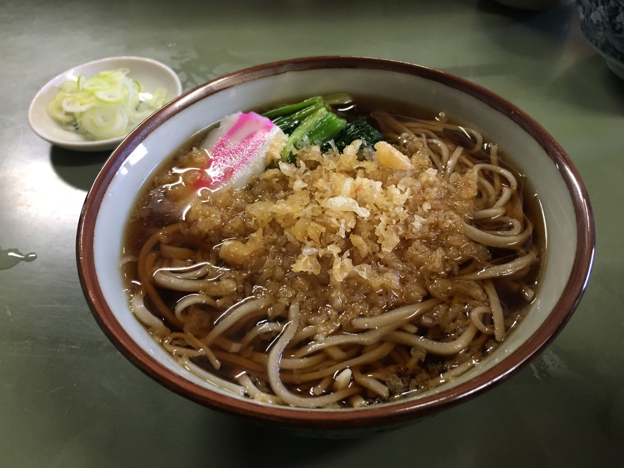 ちょいと小ぶりな丼に、ナルトにほうれん草の入った豪華なたぬきそば。ねぎは別盛りってのもうれしいサービスです。