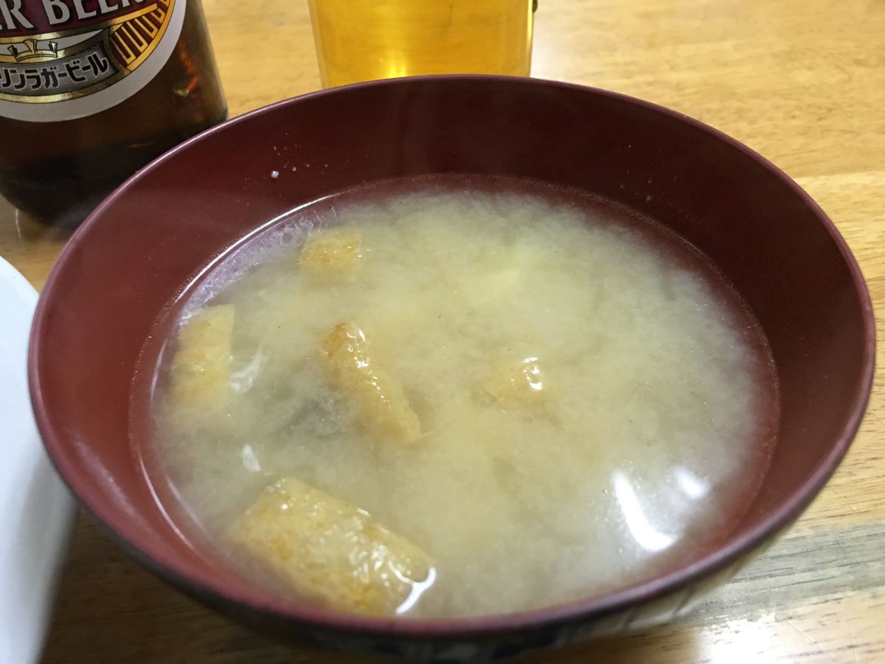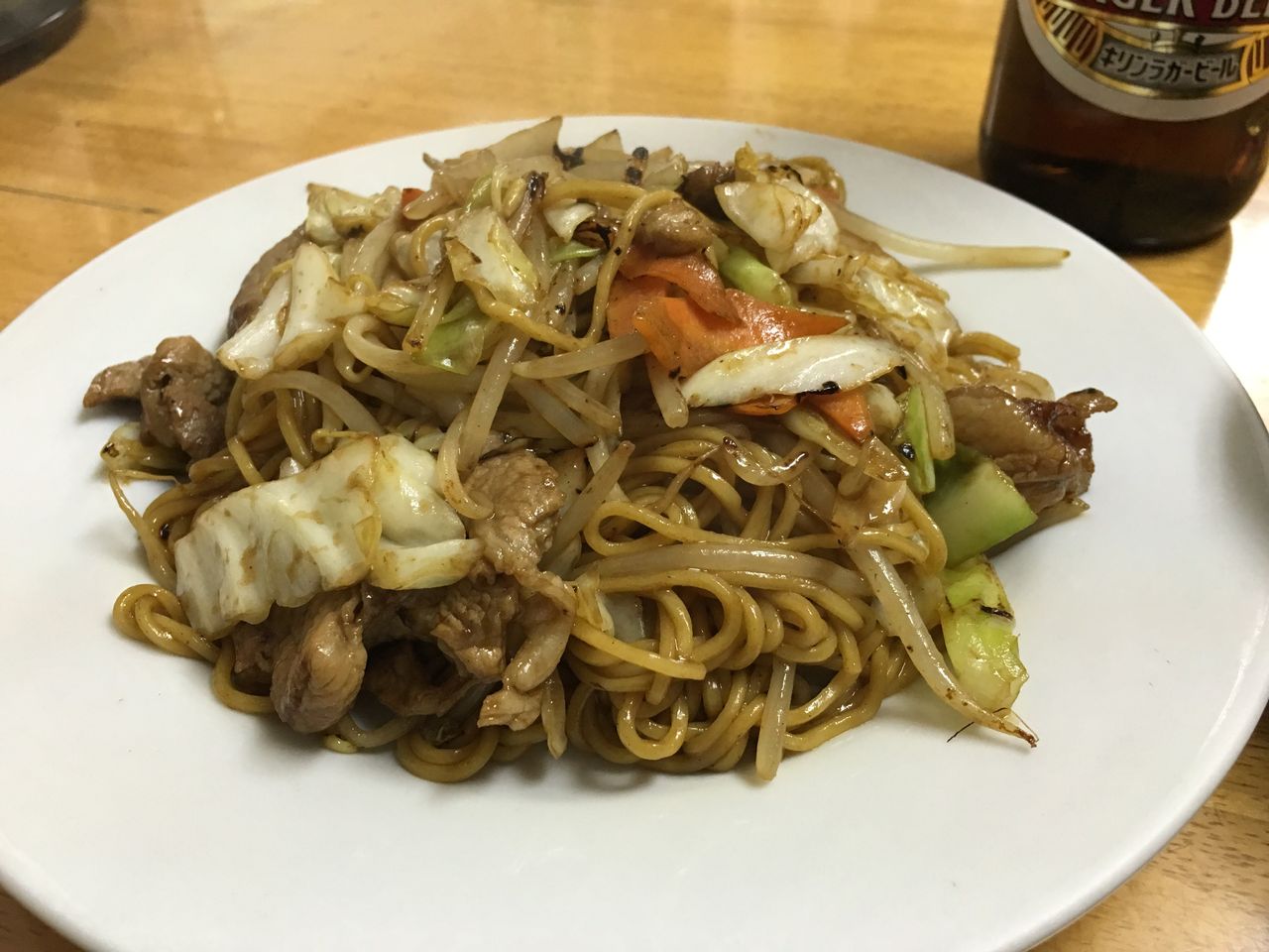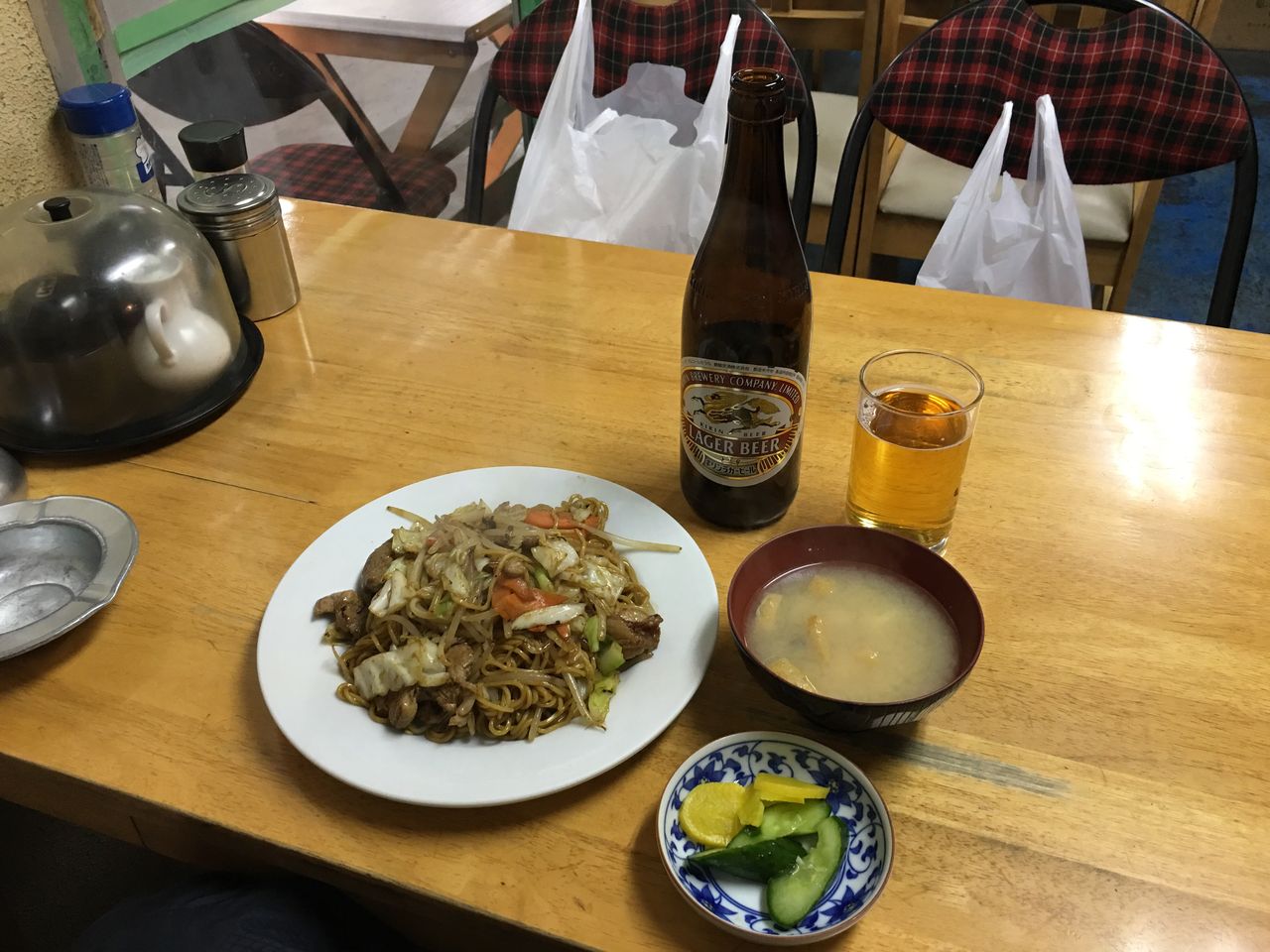 焼きそばの半分はつまみとしてビールで流し込み、残りの半分を食事としてお味噌汁と共にいただく。