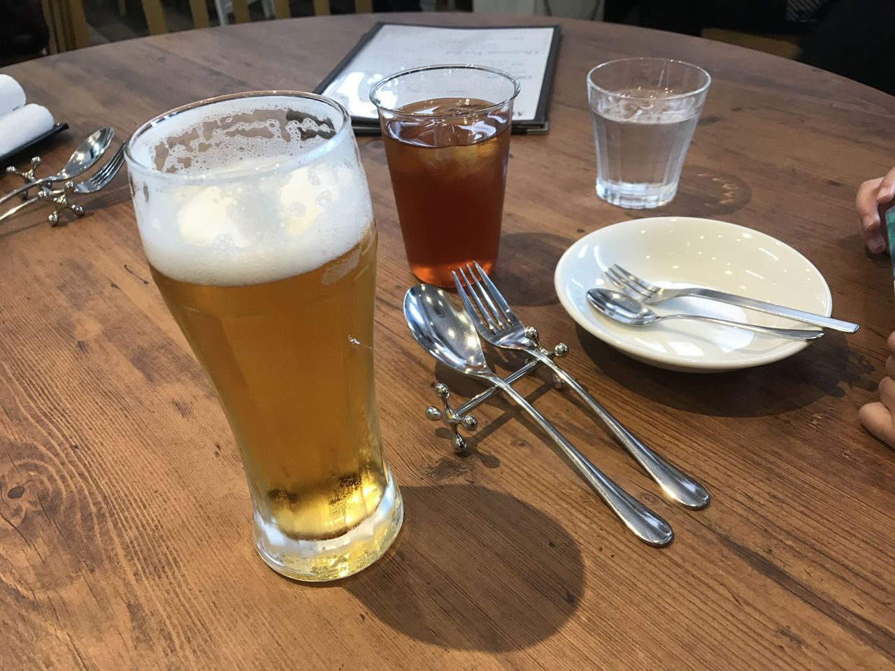 テーブルに着くとカトラリーとアイスティーが提供されます。