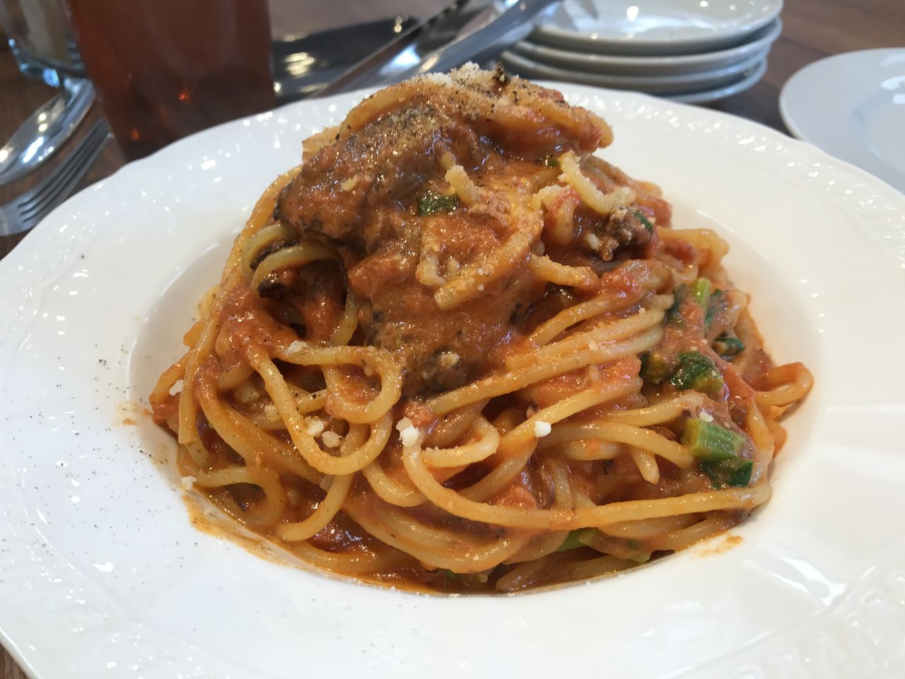 パスタは黒毛和牛のトマトクリームソース。