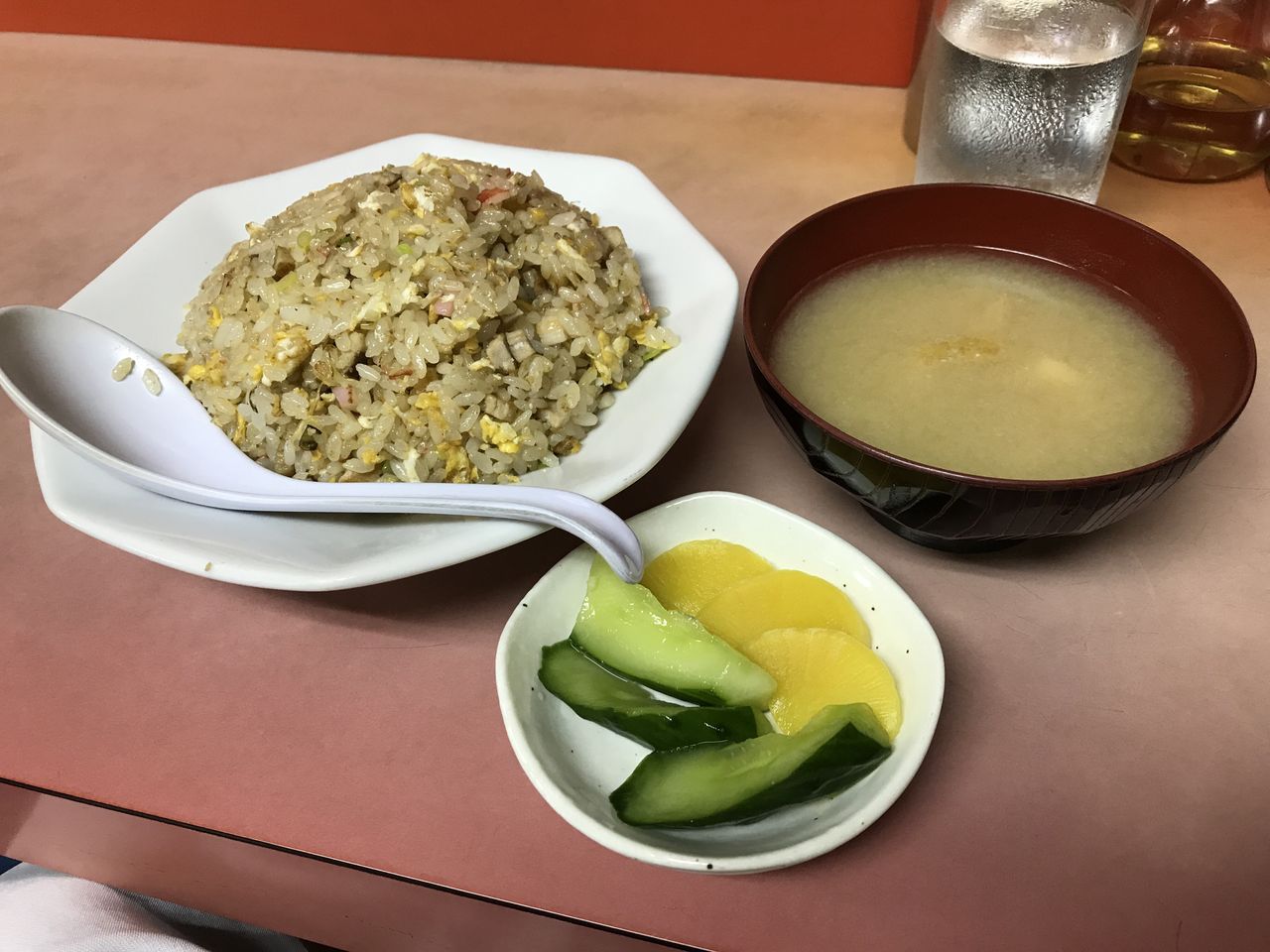 「まだいける!?」、「大丈夫ですよ。」、「じゃ炒飯お願いします。」、「味噌汁でよかったよね。」っと着席し一息つく。