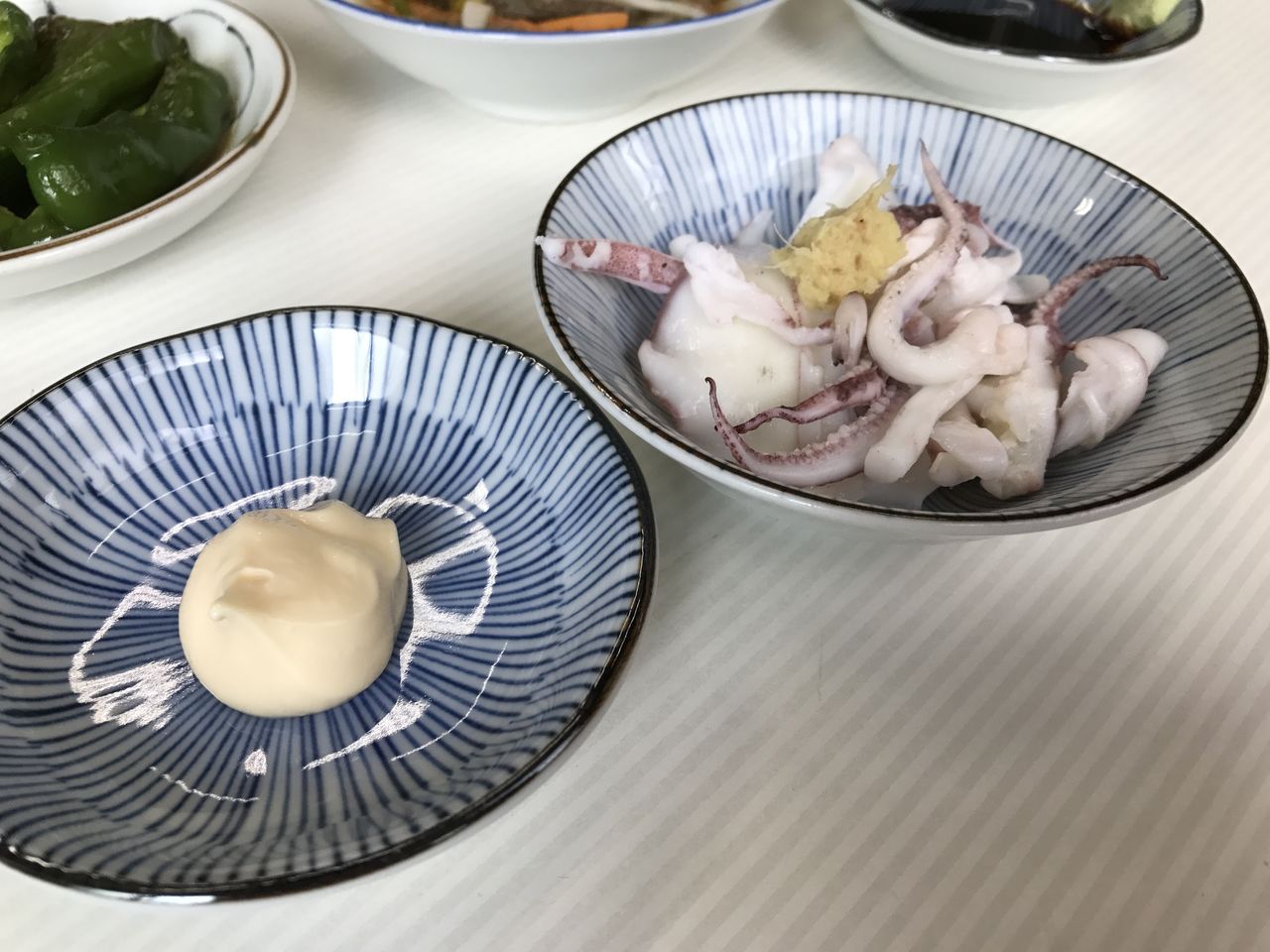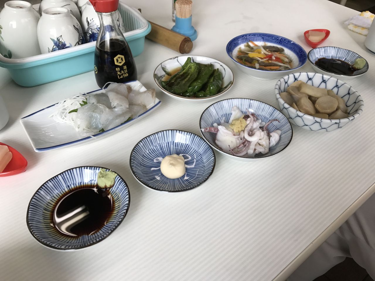 平目刺し、鯵の南蛮漬け、ピーマン炒め、ダツイモ、茹でイカ@魚源食堂