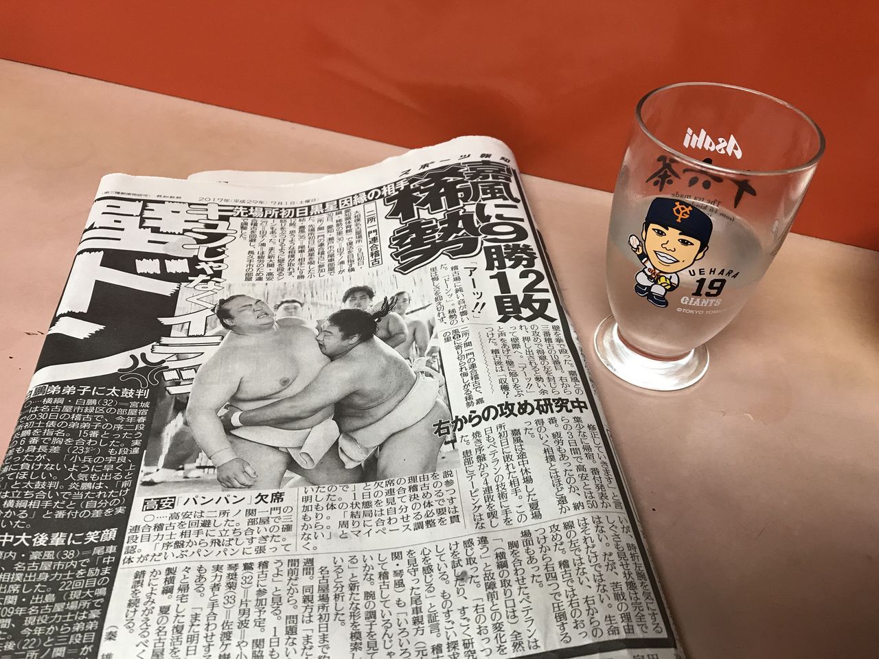 スポーツ新聞にセルフサービスの水。