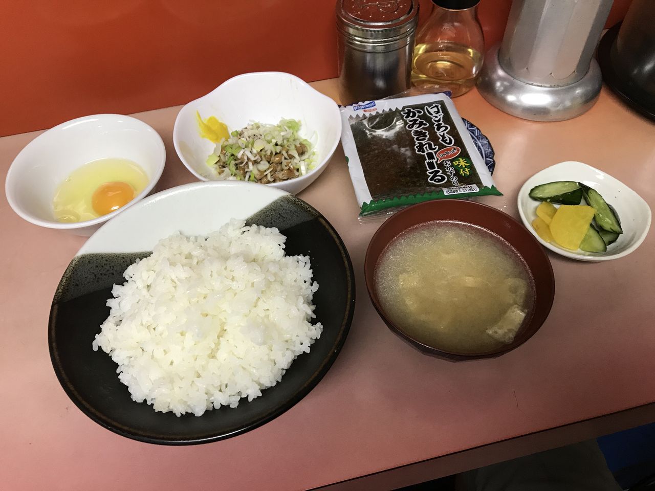 どんぶり飯に納豆、生卵、海苔までついてますね。