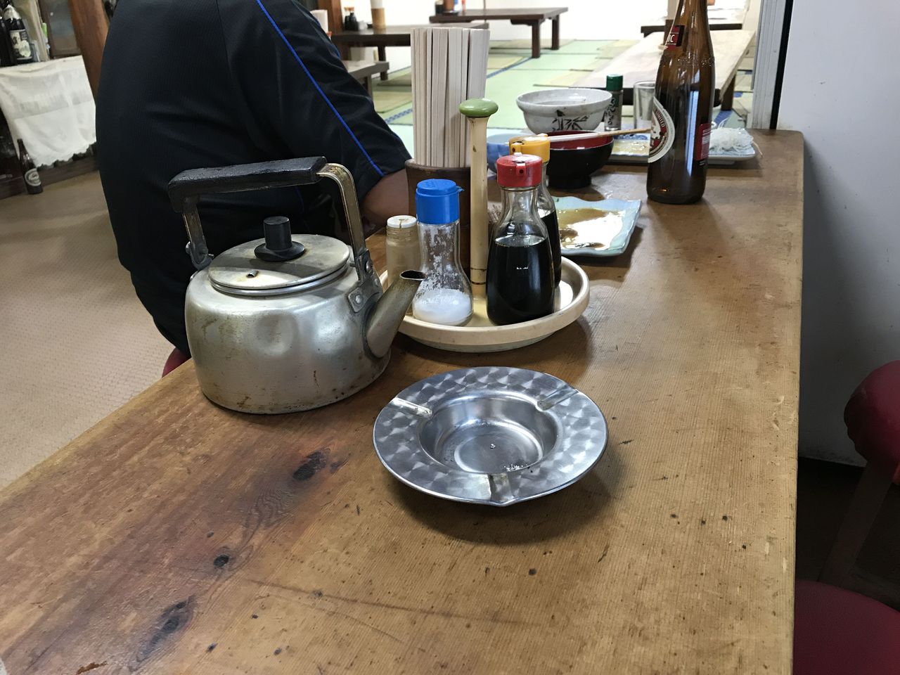 相席一枚板のテーブルには灰皿が鎮座しております。