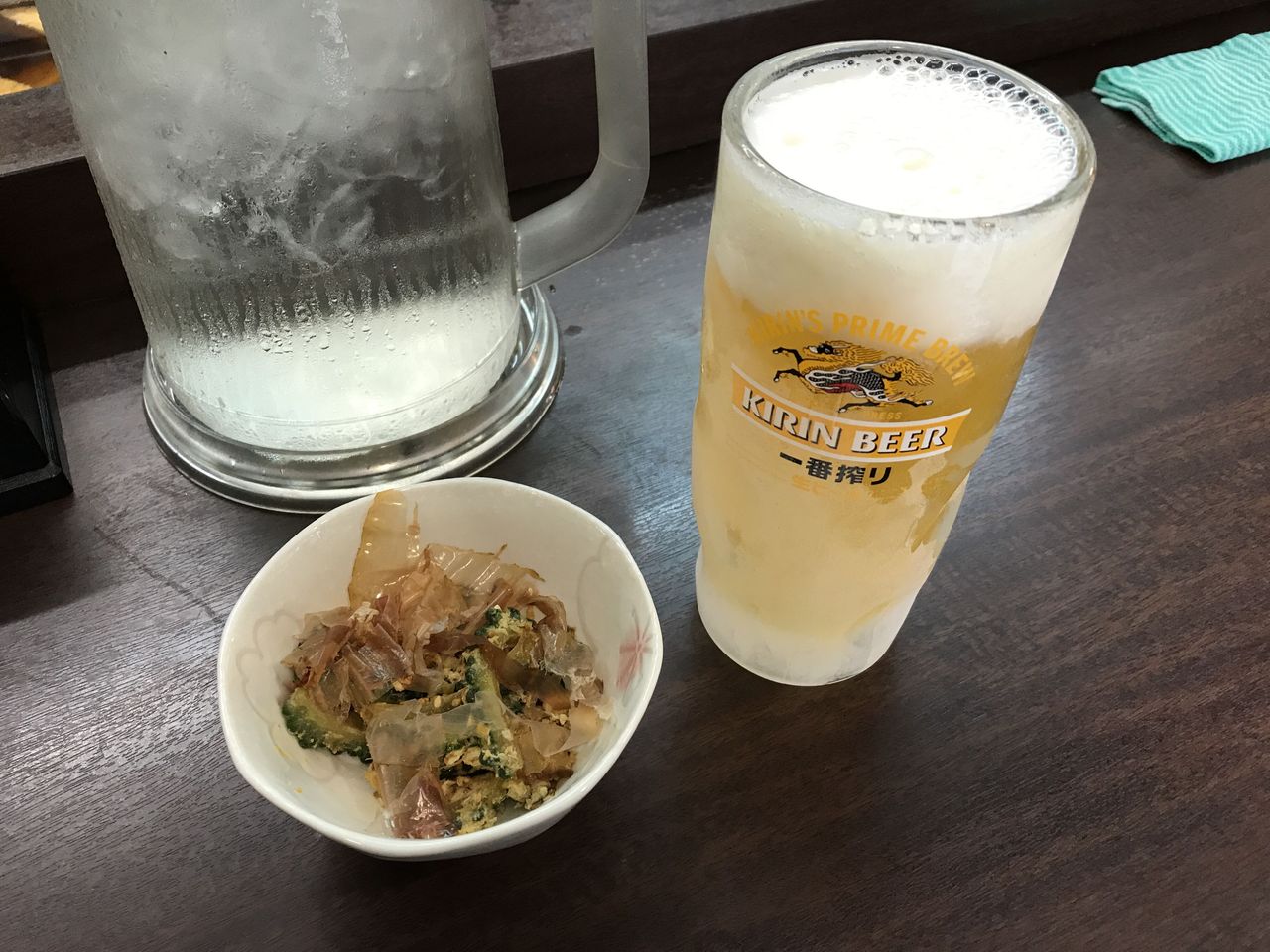 アッツイ日の昼下がりだったもので、とりあえずビールセット。ゴーヤの炒め物が夏らしいですね。