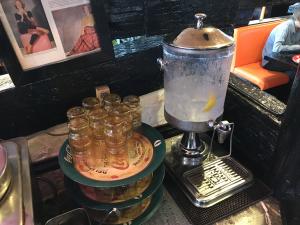 セルフサービスのお冷はレモン入り。レモネードが入っているようなサーバーがまた泣かせますね。コップの積んであるとレイがまた何とも…。