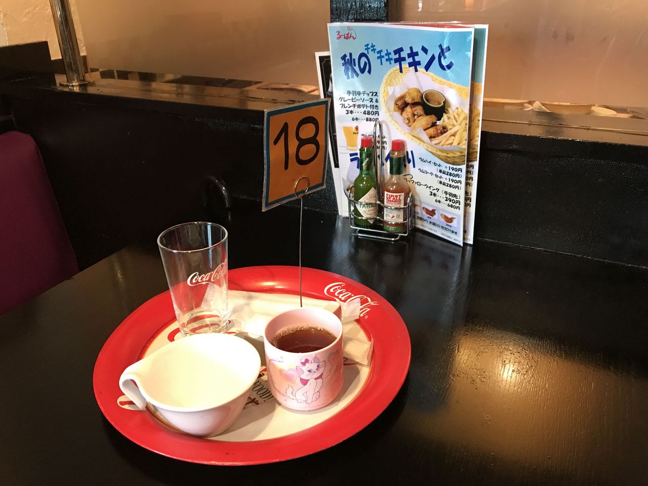 レジで注文を済ませ、ドリンクバー、スープバーの器をトレイに載せて席に着きます。