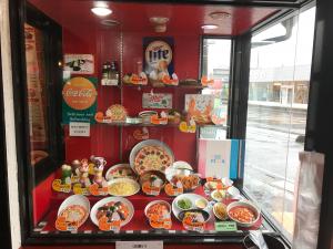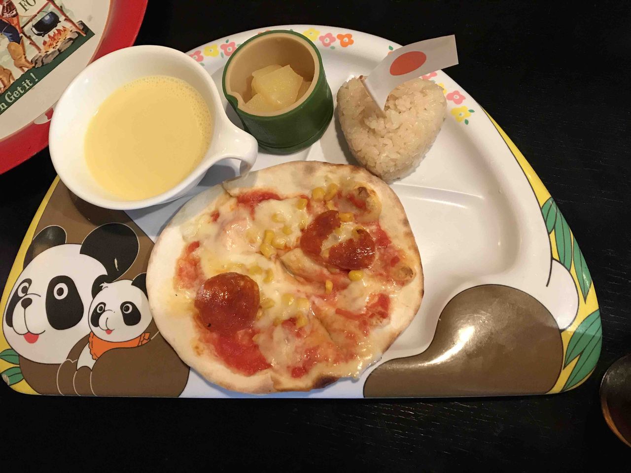 レジでチェックし、ドリンクバーですが、配膳はウエートレスさんがやってくれます。子供にお子様メニューのピザセット。おにぎりがつくってのが、古き良きアメリカに憧れていた頃の日本の食生活ですなぁ~。