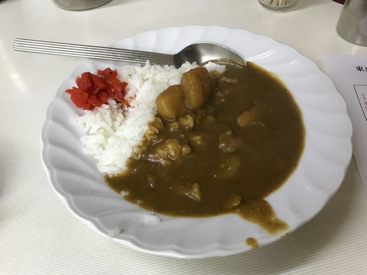 半カレー。先ほど伊勢屋さんで食べたカレーが家庭的なら、こちらのカレーは辛みの利いた職場のカレー。これは好対照ですね。