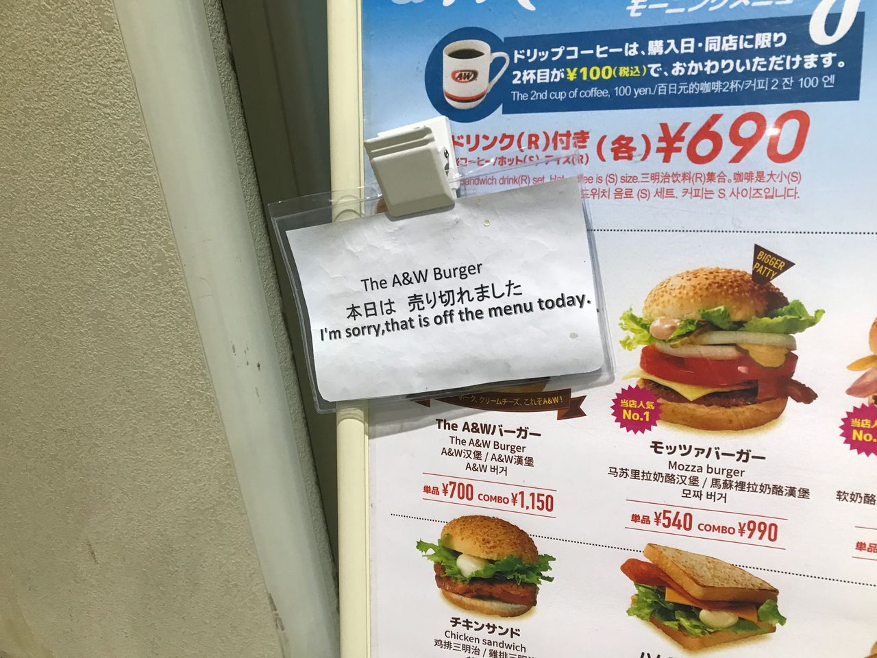 知らないふりしてA&Wバーガーを注文してみたが、売り切れと言われてしまいました。