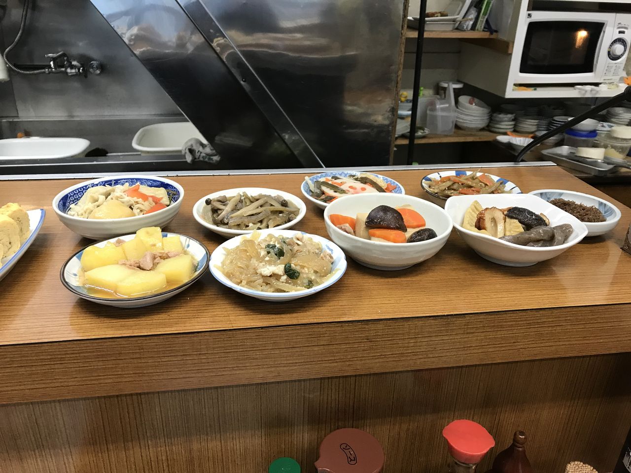 カウンターに座って左側、旦那さんの近くに揚げ物や焼き魚があり、右側にはお惣菜や茶碗蒸しがあります。
