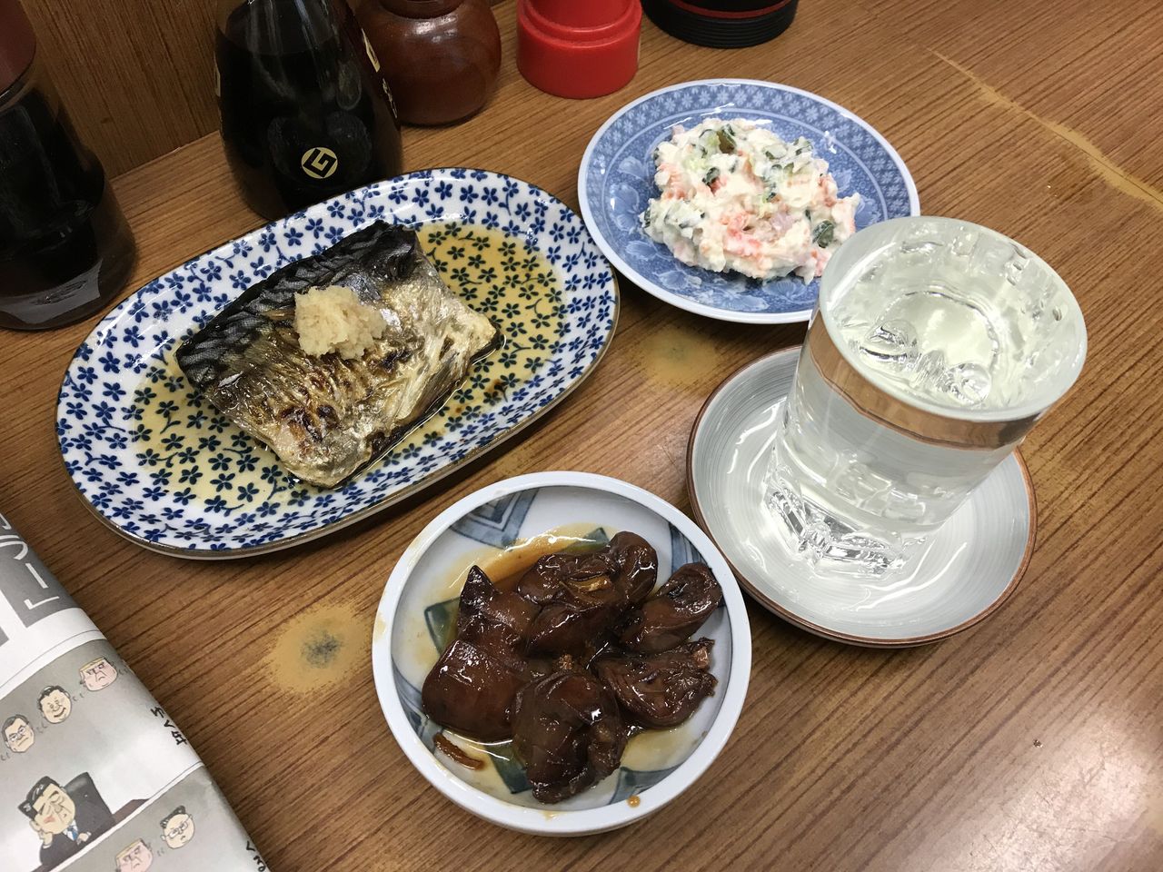 鯖塩焼き、鳥肝煮、ポテトサラダ、茶碗蒸し@魚源食堂