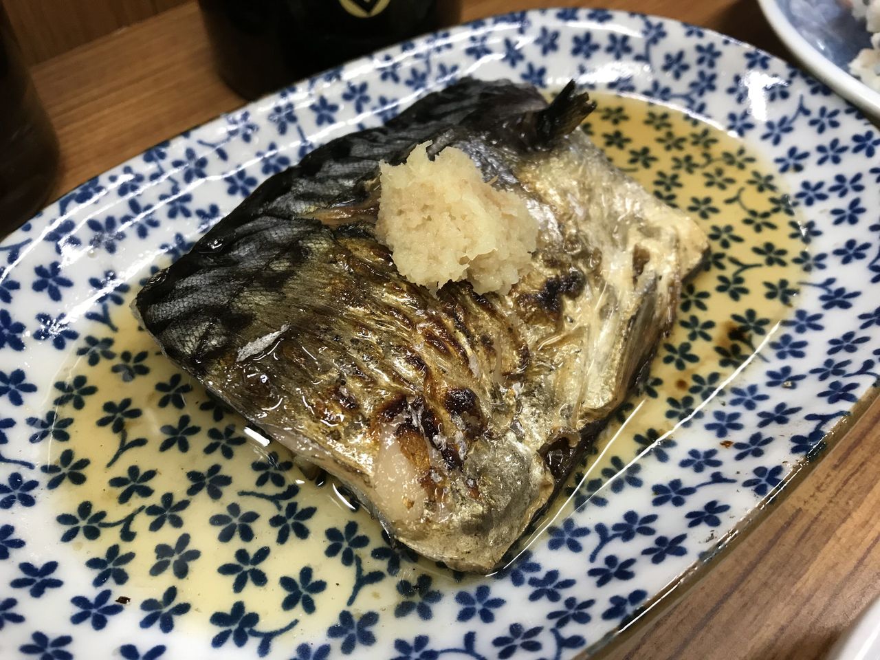 こちら魚源さんは焼き魚に生酢、三杯酢、醤油などをお好みでかけてくれて、薬味に生姜、大根おろしなど組み合わせは自由自在である。