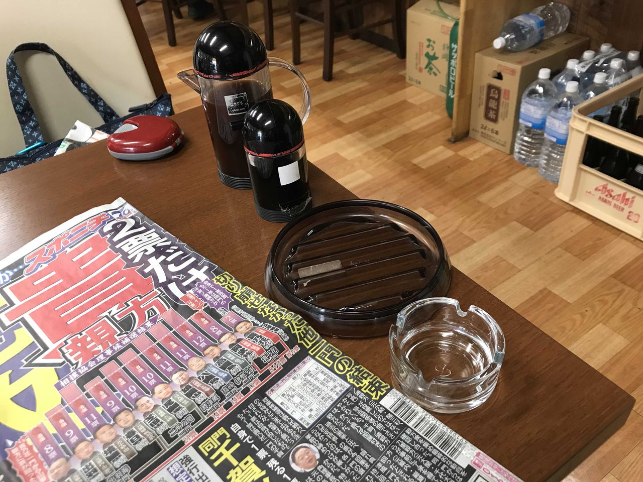 灰皿はデフォルト、スポーツ新聞は棚からとってきます。メニューは基本的に揚げ物が多いためソースと醤油が各テーブルにあります。