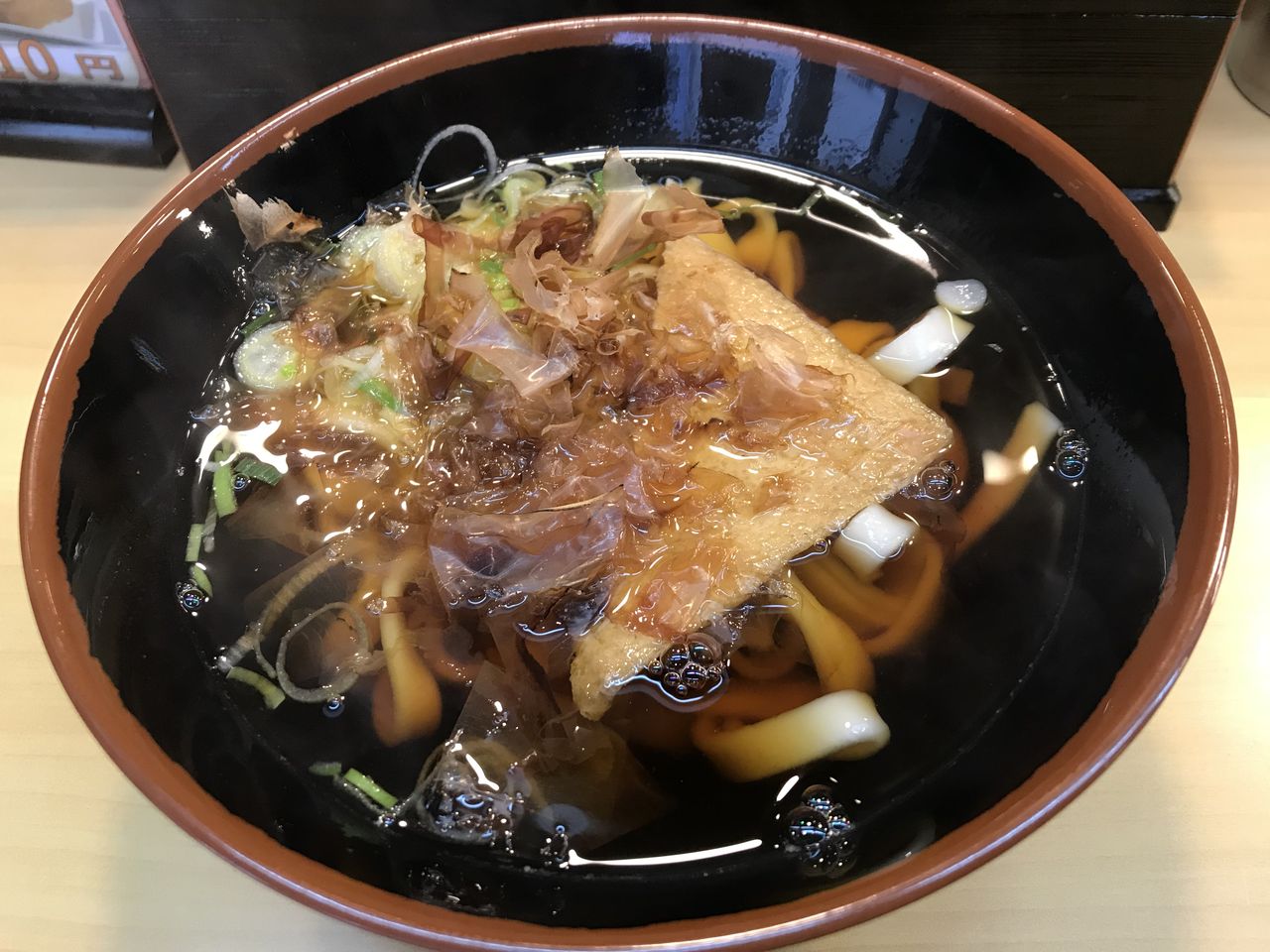 サービス過剰の愛知県はきしめんをお願いすると、油揚げにねぎ、花かつおがどっさりかかってきます。