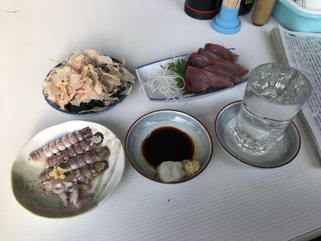 挨拶もそこそこに、お姉さんから「今日は刺身もあるよ!」っとのお声がけいただき、カツオの刺身に蝦蛄にわかめをお願いしました。