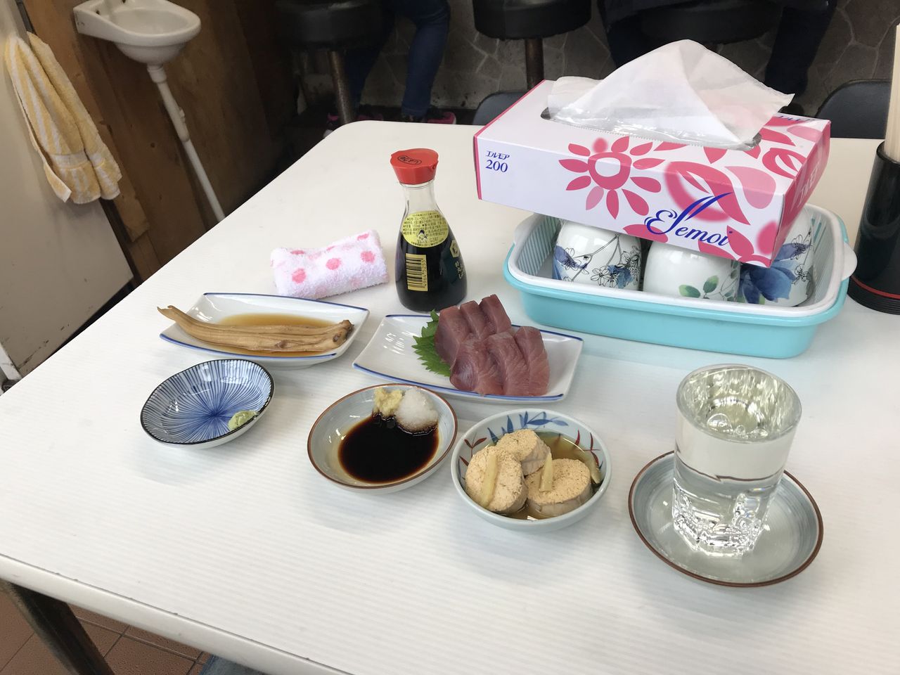 市場で鰹刺し、穴子煮、ブリの卵の煮付け、穴子煮、蝦蛄@魚源食堂(柳橋中央市場、愛知県名古屋市中村区名駅)