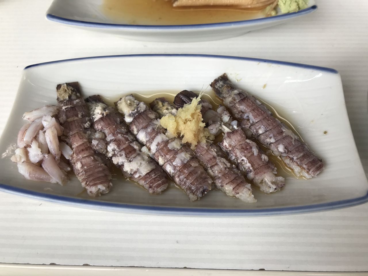 平目刺し、トリガイ、ワカメ@魚源食堂