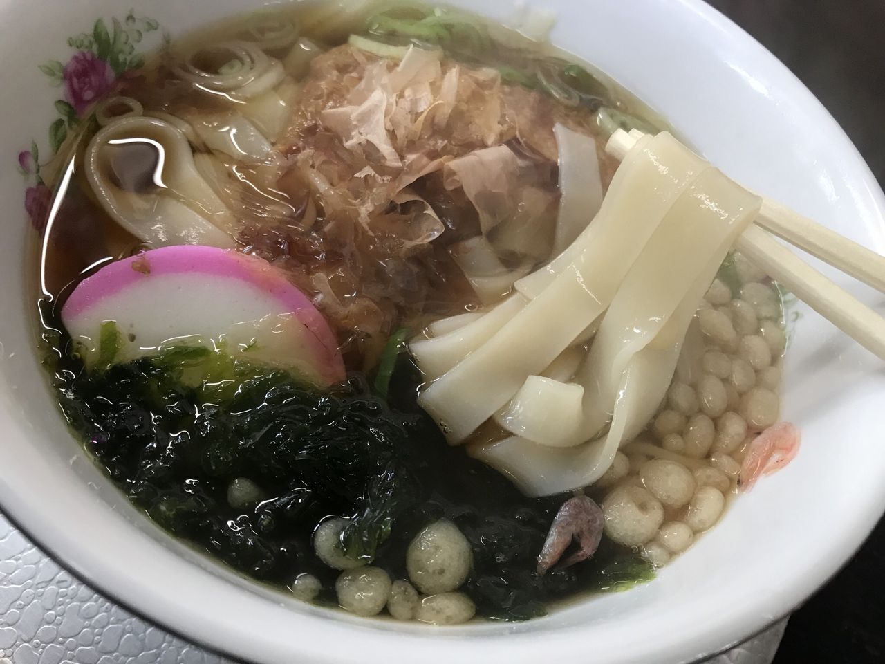 メニューにかけ麺とうたいながら、具は刻み天かす、カマボコ、油揚げ、ネギ、さらにあおさにサクラエビまで入った豪華な一品。