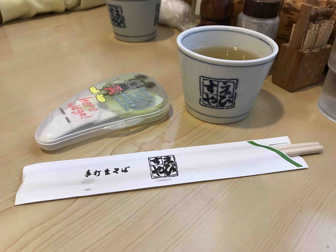 いつもの蕎麦猪口のお茶と屋号入りの割りばし、子連れなのでうどんを切るはさみが提供されます。