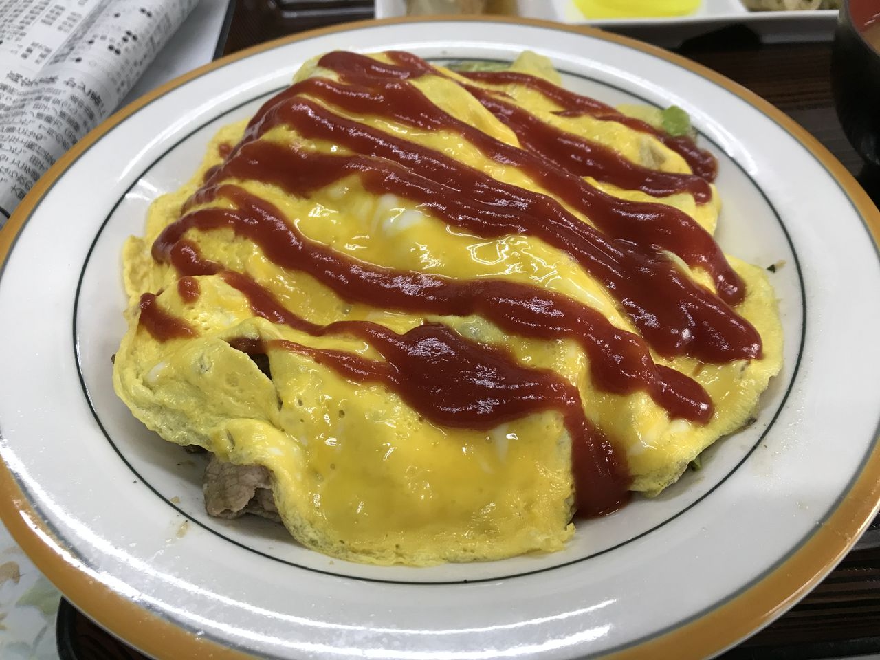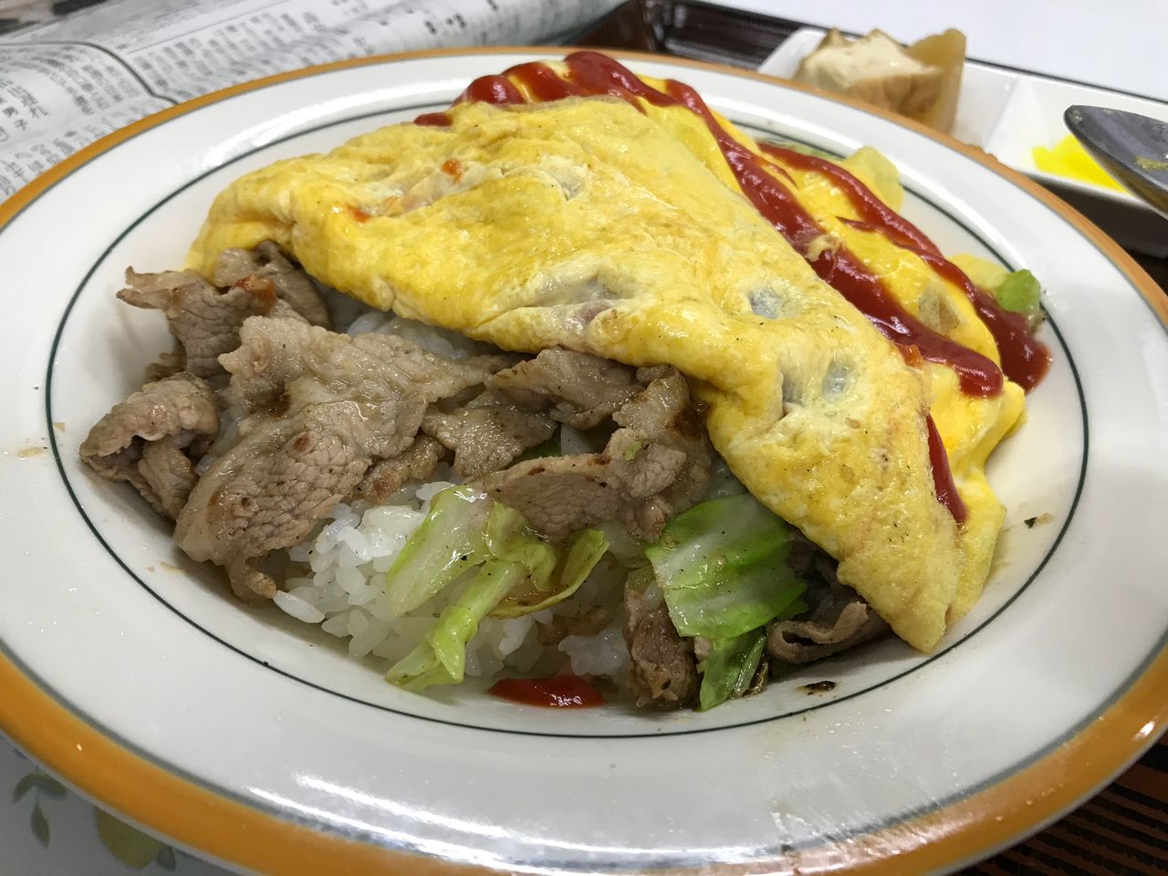 豚肉炒め!?豚肉たっぷりにキャベツ少々の炒め物がたっぷりのごはんの上に載せられております。塩コショウ油加減が滅茶苦茶米にあいますな!結構なボリュームですが、オムレツの贅沢さも味変もあり、すっと胃の腑に収まりました。